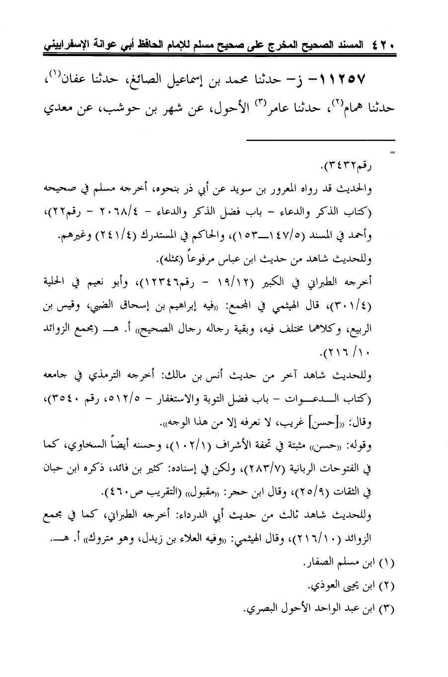 11257 - ز- حدثنا محمَّد بن إسماعيل الصائغ، حدثنا عفان (¬1)، حدثنا همام (¬2)، حدثنا عامر (¬3) الأحول، عن شهر بن حوشب، عن معدي
