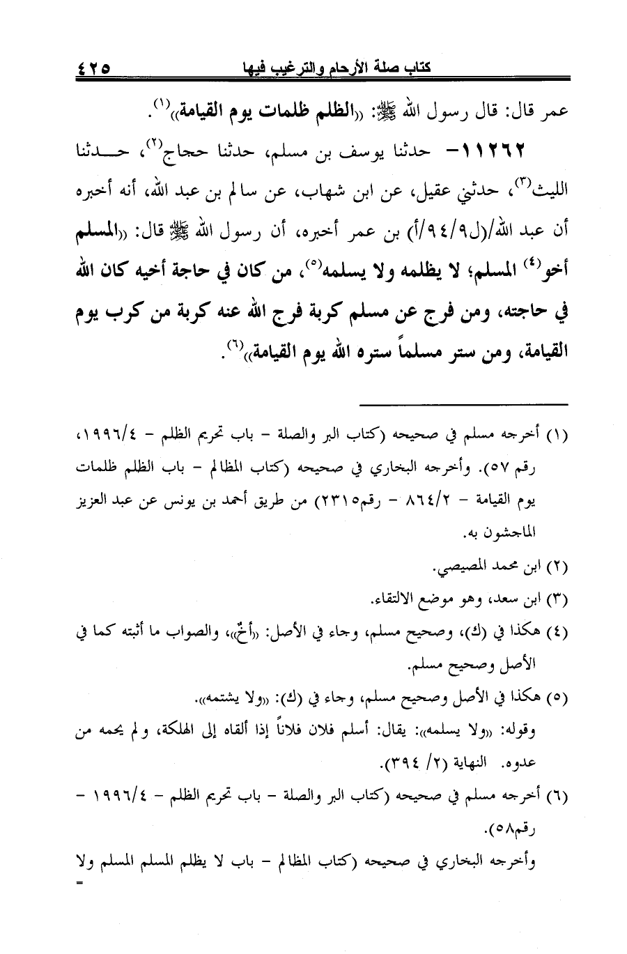 11262 - حدثنا يوسف بن مسلم، حدثنا حجاج (¬1)، حدثنا الليث (¬2)، حدثني عقيل، عن ابن شهاب، عن سالم بن عبد الله، أنه أخبره أن عبد الله بن عمر أخبره، أن رسول الله -صلى الله عليه وسلم- قال: "المسلم أخو (¬3) المسلم؛ لا يظلمه ولا يسلمه (¬4)، من كان في حاجة أخيه كان الله في حاجته، ومن فرج عن مسلم كربة فرج الله عنه كربة من كرب يوم القيامة، ومن ستر مسلمًا ستره الله يوم القيامة" (¬5).