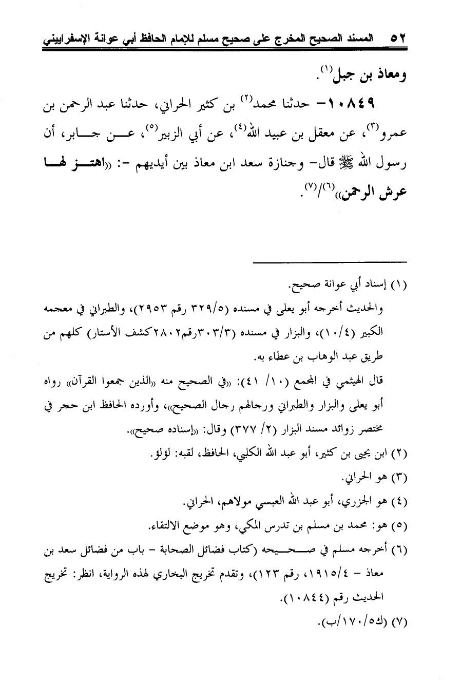 10849 - حدثنا محمد (¬1) بن كثير الحراني، حدثنا عبد الرحمن بن عمرو (¬2)، عن معقل بن عبيد الله (¬3)، عن أبي الزبير (¬4)، عن جابر، أن رسول الله -صلى الله عليه وسلم- قال -وجنازة سعد ابن معاذ بين أيديهم-: "اهتز لها عرش الرحمن" (¬5) (¬6).