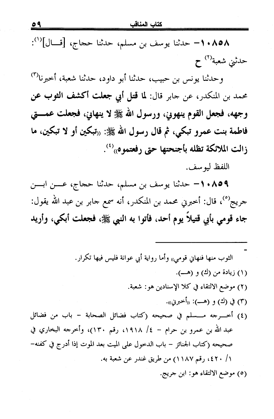 (¬4) أخرجه مسلم في صحيحه (كتاب فضائل الصحابة -باب من فضائل عبد الله بن عمرو بن حرام- 4/ 1918، رقم 130)، وأخرجه البخاري في صحيحه (كتاب الجنائز -باب الدخول على الميت بعد الموت إذا أدرج في كفنه- 1/ 420، رقم 1187) من طريق غندر عن شعبة به.
