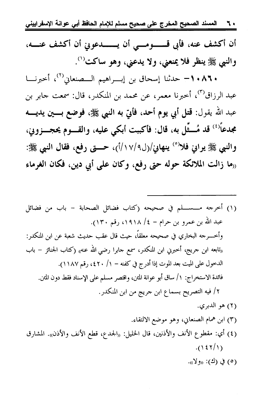 10860 - حدثنا إسحاق بن إبراهيم الصنعاني (¬1)، أخبرنا عبد الرزاق (¬2)، أخبرنا معمر، عن محمد بن المنكدر، قال: سمعت جابر بن عبد الله يقول: قتل أبي يوم أحد، فأتي به النبي -صلى الله عليه وسلم-، فوضع بين يديه مجدعًا (¬3) قد مُثِّل به، قال: فأكببت أبكي عليه، والقوم يحجزوني، والنبي -صلى الله عليه وسلم- يراني فلا (¬4) ينهاني، حتى رفع، فقال النبي -صلى الله عليه وسلم-: "ما زالت الملائكة حوله حتى رفع، وكان على أبي دين، فكان الغرماء