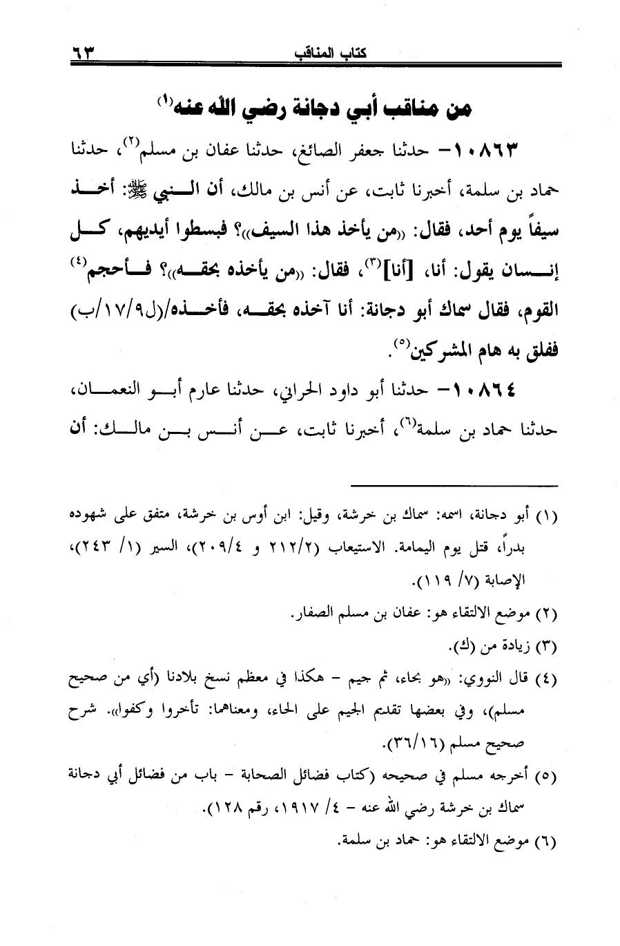 10863 - حدثنا جعفر الصائغ، حدثنا عفان بن مسلم (¬1)، حدثنا حماد بن سلمة، أخبرنا ثابت، عن أنس بن مالك، أن النبي -صلى الله عليه وسلم-: أخذ سيفًا يوم أحد، فقال: "من يأخذ هذا السيف"؟ فبسطوا أيديهم، كل إنسان يقول: أنا، [أنا] (¬2)، فقال: "من يأخذه بحقه"؟ فأحجم (¬3) القوم، فقال سماك أبو دجانة: أنا آخذه بحقه، فأخذه ففلق به هام المشركين (¬4).