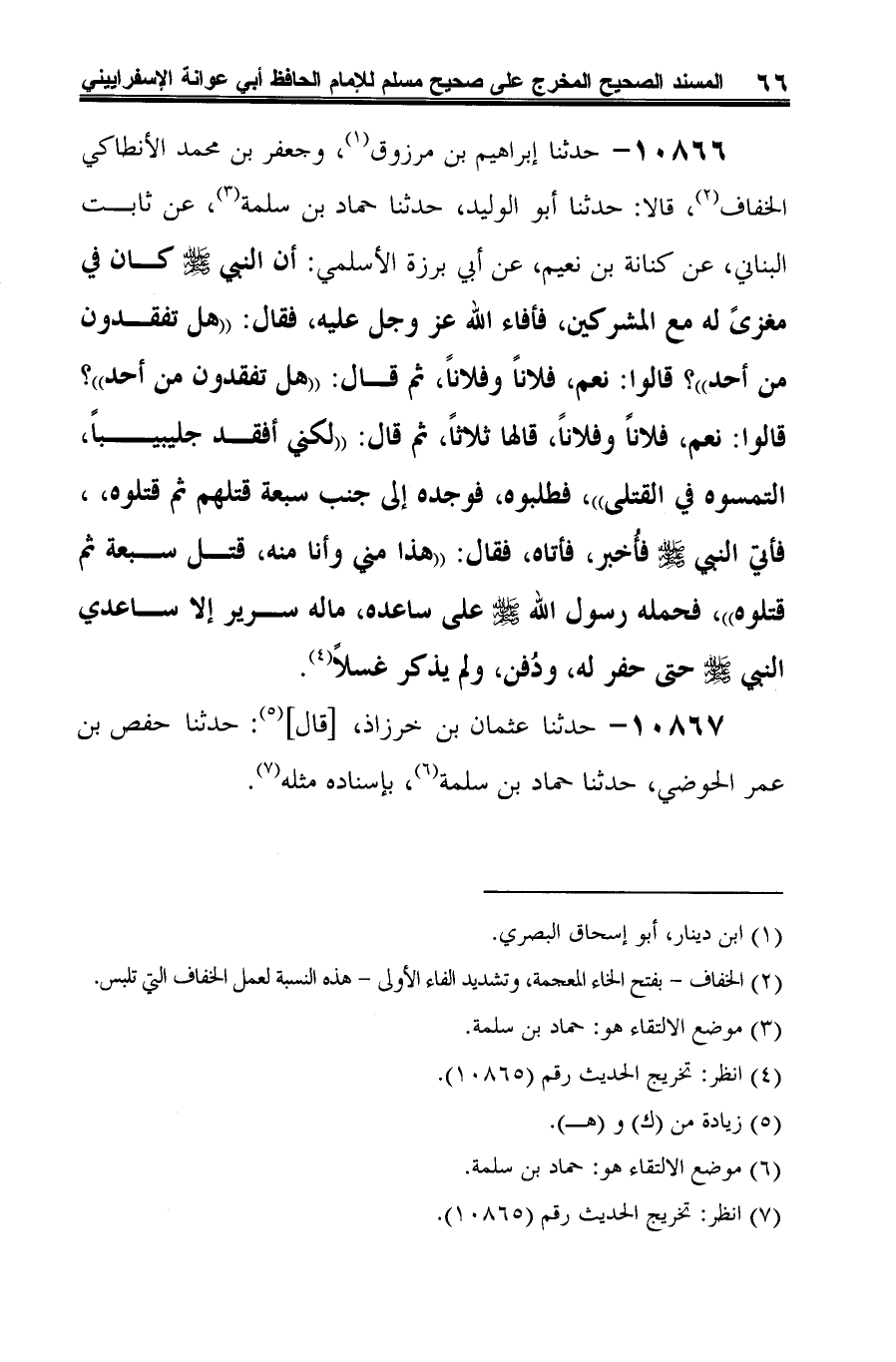 10866 - حدثنا إبراهيم بن مرزوق (¬1)، وجعفر بن محمد الأنطاكي الخفاف (¬2)، قالا: حدثنا أبو الوليد، حدثنا حماد بن سلمة (¬3)، عن ثابت البناني، عن كنانة بن نعيم، عن أبي برزة الأسلمي: أن النبي -صلى الله عليه وسلم- كان في مغزىً له مع المشركين، فأفاء الله عز وجل عليه، فقال: "هل تفقدون من أحد"؟ قالوا: نعم، فلانًا وفلانًا، ثم قال: "هل تفقدون من أحد"؟ قالوا: نعم، فلانًا وفلانًا، قالها ثلاثًا، ثم قال: "لكني أفقد جليبيبًا، التمسوه في القتلى"، فطلبوه، فوجده إلى جنب سبعة قتلهم ثم قتلوه، فأتي النبي -صلى الله عليه وسلم- فأُخبر، فأتاه، فقال: "هذا مني وأنا منه، قتل سبعة ثم قتلوه"، فحمله رسول الله -صلى الله عليه وسلم- على ساعده، ما له سرير إلا ساعدي النبي -صلى الله عليه وسلم- حتى حفر له، ودُفن، ولم يذكر غسلًا (¬4).