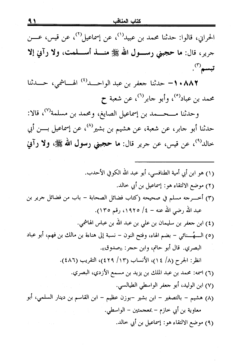 وحدثنا محمد بن إسماعيل الصايغ، ومحمد بن مسلمة (¬4)، قالا: حدثنا أَبو جابر، عن شعبة، عن هشيم بن بشير (¬5)، عن إسماعيل بن أبي خالد (¬6)، عن قيس، عن جرير قال: ما حجبني رسول الله -صلى الله عليه وسلم-، ولا رآني