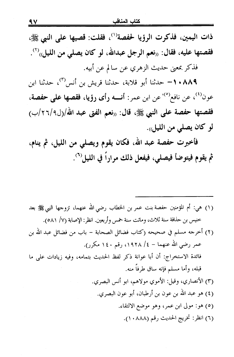 10889 - حدثنا أَبو قلابة، حدثنا قريش بن أنس (¬1)، حدثنا ابن عون (¬2)، عن نافع (¬3) عن ابن عمر: أنه رأى رؤيا، فقصها على حفصة، فقصتها حفصة على النبي -صلى الله عليه وسلم-، قال: "نعم الفتى عبد الله لو كان يصلي من الليل".