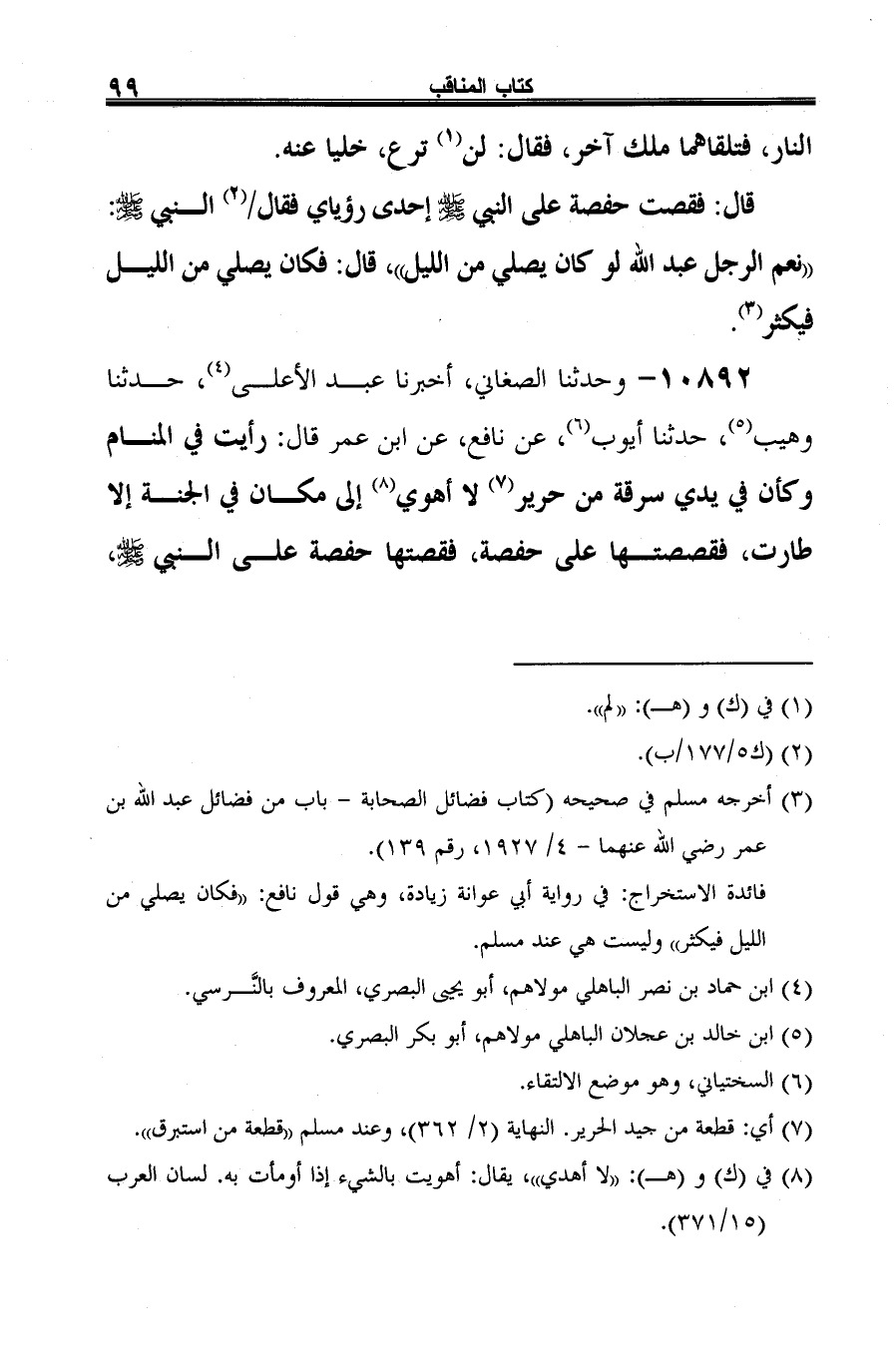 10892 - وحدثنا الصغاني، أخبرنا عبد الأعلى (¬1)، حدثنا وهيب (¬2)، حدثنا أيوب (¬3)، عن نافع، عن ابن عمر قال: رأيت في المنام وكأن في يدي سرقة من حرير (¬4) لا أهوي (¬5) إلى مكان في الجنة إلا طارت، فقصصتها على حفصة، فقصتها حفصة على النبي -صلى الله عليه وسلم-،