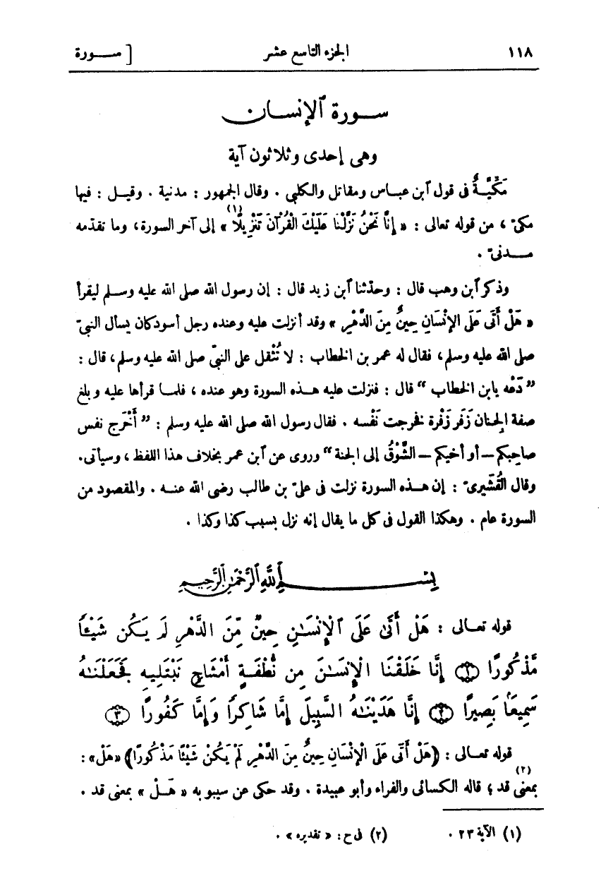 سُورَةُ الْإِنْسَانِ وَهِيَ إِحْدَى وَثَلَاثُونَ آيَةً مَكِّيَّةٌ فِي قَوْلِ ابْنِ عَبَّاسٍ وَمُقَاتِلٍ وَالْكَلْبِيِّ. وَقَالَ الْجُمْهُورُ: مَدَنِيَّةٌ. وَقِيلَ: فِيهَا مَكِّيٌّ، مِنْ قَوْلِهِ تَعَالَى: إِنَّا نَحْنُ نَزَّلْنا عَلَيْكَ الْقُرْآنَ تَنْزِيلًا «١» [الإنسان: ٢٣] إِلَى آخِرِ السُّورَةِ، وَمَا تَقَدَّمَهُ مَدَنِيٌّ. وَذَكَرَ ابْنُ وَهْبٍ قَالَ: وَحَدَّثَنَا ابْنُ زَيْدٍ قَالَ: إِنَّ رَسُولَ اللَّهِ صَلَّى اللَّهُ عَلَيْهِ وَسَلَّمَ لَيَقْرَأُ (هَلْ أَتى عَلَى الْإِنْسانِ حِينٌ مِنَ الدَّهْرِ) وَقَدْ أُنْزِلَتْ عَلَيْهِ وَعِنْدَهُ رَجُلٌ أَسْوَدُ كَانَ يَسْأَلُ النَّبِيِّ صَلَّى اللَّهُ عَلَيْهِ وَسَلَّمَ، فَقَالَ لَهُ عُمَرُ بْنُ الْخَطَّابِ: لَا تُثْقِلْ عَلَى النَّبِيِّ صَلَّى اللَّهُ عَلَيْهِ وَسَلَّمَ، قَالَ: (دعه يا ابن الْخَطَّابِ) قَالَ: فَنَزَلَتْ عَلَيْهِ هَذِهِ السُّورَةُ وَهُوَ عِنْدُهُ، فَلَمَّا قَرَأَهَا عَلَيْهِ وَبَلَغَ صِفَةَ الْجِنَانِ زَفَرَ زَفْرَةً فَخَرَجَتْ نَفْسِهِ. فَقَالَ رَسُولُ اللَّهِ صَلَّى اللَّهُ عَلَيْهِ وَسَلَّمَ: (أَخْرَجَ نَفْسَ صَاحِبِكُمْ- أَوْ أَخِيكُمْ- الشَّوْقُ إِلَى الْجَنَّةِ) وَرُوِيَ عَنِ ابْنِ عُمَرَ بِخِلَافِ هَذَا اللَّفْظِ، وَسَيَأْتِي. وَقَالَ الْقُشَيْرِيُّ: إِنَّ هَذِهِ السُّورَةَ نَزَلَتْ فِي عَلِيِّ بن طَالِبٍ رَضِيَ اللَّهُ عَنْهُ. وَالْمَقْصُودُ مِنَ السُّورَةِ عَامٌّ. وَهَكَذَا الْقَوْلُ فِي كُلِّ مَا يُقَالُ إِنَّهُ نَزَلَ بِسَبَبِ كَذَا وَكَذَا.