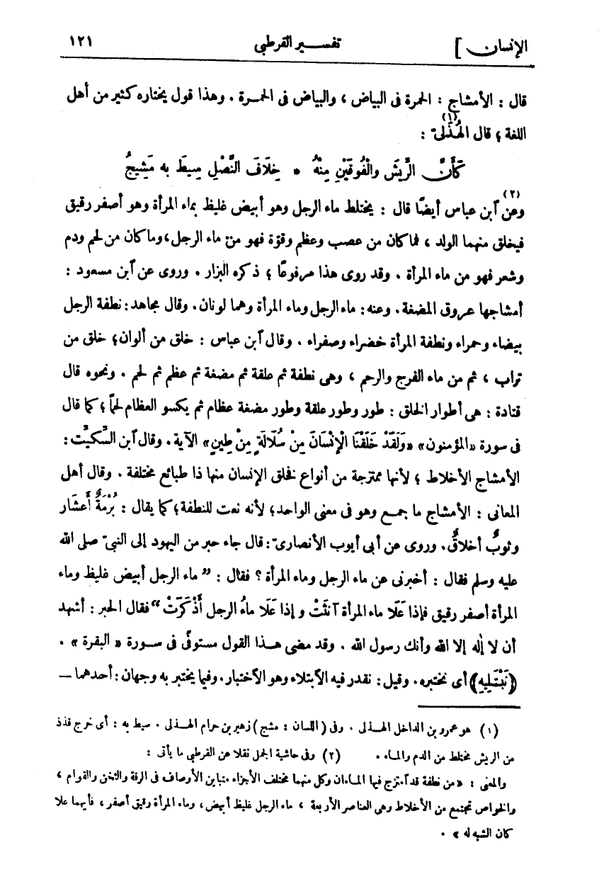 (٢). وفي حاشية الجمل نقلا عن القرطبي ما يأتي: والمعنى: (من نطفة قد امتزج فيها الماءان وكل منهما مختلف الاجزاء متباين الأوصاف في الرقة والثخن والقوام، والخواص تجتمع من الأخلاط وهي العناصر الاربعة ماء الرجل غليظ أبيض وماء المرأة رقيق أصفر فأيهما علا كان الشبه له (.)