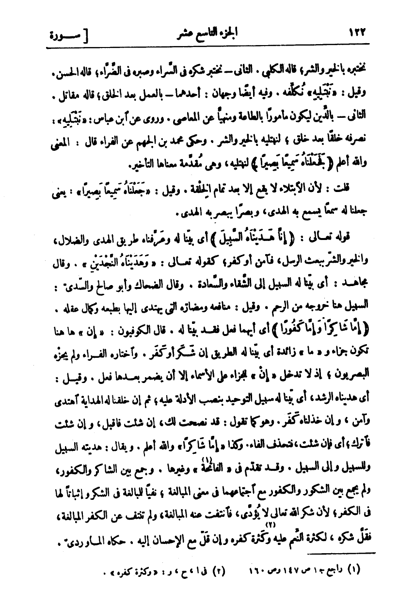 نختبره بالخير والشر، قال الْكَلْبِيُّ. الثَّانِي- نَخْتَبِرُ شُكْرَهُ فِي السَّرَّاءِ وَصَبْرَهُ فِي الضَّرَّاءِ، قَالَهُ الْحَسَنُ. وَقِيلَ: نَبْتَلِيهِ نُكَلِّفُهُ. وَفِيهِ أَيْضًا وَجْهَانِ: أَحَدُهُمَا- بِالْعَمَلِ بَعْدَ الْخَلْقِ، قَالَهُ مُقَاتِلٌ. الثَّانِي- بِالدِّينِ لِيَكُونَ مَأْمُورًا بِالطَّاعَةِ وَمَنْهِيًّا عَنِ الْمَعَاصِي. وَرُوِيَ عَنِ ابْنِ عَبَّاسٍ: نَبْتَلِيهِ: نُصَرِّفُهُ خَلْقًا بَعْدَ خَلْقٍ، لِنَبْتَلِيَهُ بِالْخَيْرِ وَالشَّرِّ. وَحَكَى مُحَمَّدُ بْنُ الْجَهْمِ عَنِ الْفَرَّاءِ قَالَ: الْمَعْنَى وَاللَّهُ أَعْلَمُ (فَجَعَلْناهُ سَمِيعاً بَصِيراً) لِنَبْتَلِيَهُ، وَهِيَ مُقَدَّمَةٌ مَعْنَاهَا التَّأْخِيرُ. قُلْتُ: لِأَنَّ الِابْتِلَاءَ لَا يَقَعُ إِلَّا بَعْدَ تَمَامِ الْخِلْقَةِ. وقيل: فَجَعَلْناهُ سَمِيعاً بَصِيراً: يَعْنِي جَعَلْنَا لَهُ سَمْعًا يَسْمَعُ بِهِ الْهُدَى، وَبَصَرًا يُبْصِرُ بِهِ الْهُدَى. قَوْلُهُ تَعَالَى: (إِنَّا هَدَيْناهُ السَّبِيلَ) أَيْ بَيَّنَّا لَهُ وَعَرَّفْنَاهُ طَرِيقَ الْهُدَى وَالضَّلَالِ، وَالْخَيْرِ وَالشَّرِّ بِبَعْثِ الرُّسُلِ، فَآمَنَ أَوْ كَفَرَ، كَقَوْلِهِ تَعَالَى: وَهَدَيْناهُ النَّجْدَيْنِ [البلد: ١٠]. وَقَالَ مُجَاهِدٌ: أَيْ بَيَّنَّا لَهُ السَّبِيلَ إِلَى الشَّقَاءِ وَالسَّعَادَةِ. وَقَالَ الضَّحَّاكُ وَأَبُو صَالِحٍ وَالسُّدِّيُّ: السَّبِيلُ هُنَا خُرُوجُهُ مِنَ الرَّحِمِ. وَقِيلَ: مَنَافِعُهُ وَمَضَارُّهُ الَّتِي يَهْتَدِي إِلَيْهَا بِطَبْعِهِ وَكَمَالِ عَقْلِهِ. (إِمَّا شاكِراً وَإِمَّا كَفُوراً) أَيْ أَيُّهُمَا فَعَلَ فقد بينا له. قال الكوفيون: (إن) ها هنا تَكُونُ جَزَاءً وَ (مَا) زَائِدَةٌ أَيْ بَيَّنَّا لَهُ الطَّرِيقَ إِنْ شَكَرَ أَوْ كَفَرَ. وَاخْتَارَهُ الْفَرَّاءُ وَلَمْ يُجِزْهُ الْبَصْرِيُّونَ، إِذْ لَا تَدْخُلُ (إِنْ) لِلْجَزَاءِ عَلَى الْأَسْمَاءِ إِلَّا أَنْ يُضْمَرَ بَعْدَهَا فِعْلٌ. وَقِيلَ: أَيْ هَدَيْنَاهُ الرُّشْدَ، أَيْ بَيَّنَّا لَهُ سَبِيلَ التَّوْحِيدِ بِنَصْبِ الْأَدِلَّةِ عَلَيْهِ، ثُمَّ إِنْ خَلَقْنَا لَهُ الْهِدَايَةَ اهْتَدَى وَآمَنَ، وَإِنْ خَذَلْنَاهُ كَفَرَ. وَهُوَ كَمَا تَقُولُ: قَدْ نَصَحْتُ لَكَ، إِنْ شِئْتَ فَاقْبَلْ، وَإِنْ شِئْتَ فَاتْرُكْ، أَيْ فَإِنْ شِئْتَ، فَتُحْذَفُ الْفَاءُ. وَكَذَا إِمَّا شاكِراً وَاللَّهُ أَعْلَمُ. وَيُقَالُ: هَدَيْتُهُ السَّبِيلَ وَلِلسَّبِيلِ وَإِلَى السَّبِيلِ. وَقَدْ تَقَدَّمَ فِي" الْفَاتِحَةِ" «١» وَغَيْرِهَا. وَجَمَعَ بَيْنَ الشَّاكِرِ وَالْكَفُورِ، وَلَمْ يَجْمَعْ بَيْنَ الشَّكُورِ وَالْكَفُورِ مَعَ اجْتِمَاعِهِمَا فِي مَعْنَى الْمُبَالَغَةِ، نَفْيًا لِلْمُبَالَغَةِ فِي الشُّكْرِ وَإِثْبَاتًا لَهَا فِي الْكُفْرِ، لِأَنَّ شُكْرَ اللَّهِ تَعَالَى لَا يُؤَدَّى، فَانْتَفَتْ عَنْهُ الْمُبَالَغَةُ، وَلَمْ تَنْتَفِ عَنِ الْكُفْرِ الْمُبَالَغَةُ، فَقَلَّ شُكْرُهُ، لِكَثْرَةِ النِّعَمِ عَلَيْهِ «٢» وَكَثْرَةِ كُفْرِهِ وَإِنْ قَلَّ مَعَ الْإِحْسَانِ إِلَيْهِ. حكاه الماوردي.