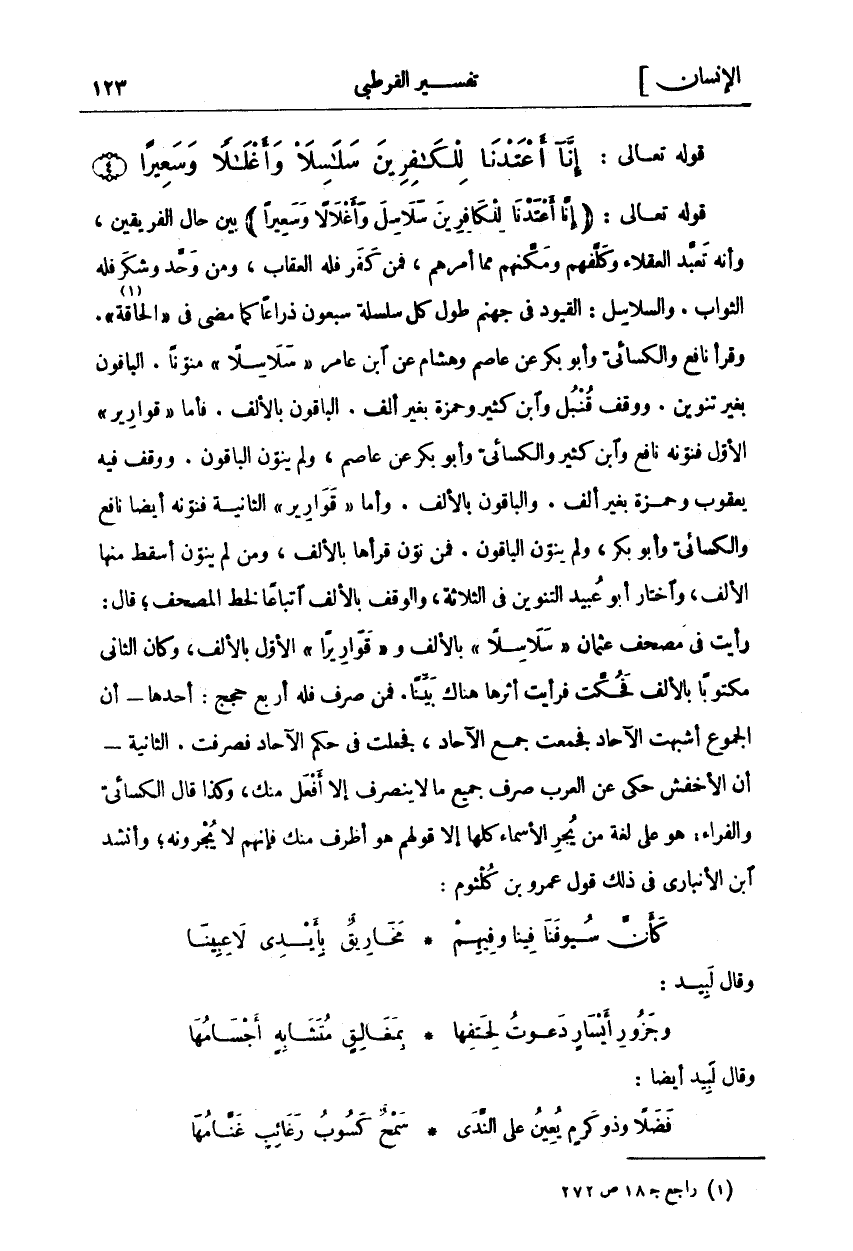 قَوْلُهُ تَعَالَى: (إِنَّا أَعْتَدْنا لِلْكافِرِينَ سَلاسِلَ وَأَغْلالًا وَسَعِيراً) بَيَّنَ حَالَ الْفَرِيقَيْنِ، وَأَنَّهُ تَعَبَّدَ الْعُقَلَاءَ وَكَلَّفَهُمْ وَمَكَّنَهُمْ مِمَّا أَمَرَهُمْ، فَمَنْ كَفَرَ فَلَهُ الْعِقَابُ، وَمَنْ وَحَّدَ وَشَكَرَ فَلَهُ الثَّوَابُ. وَالسَّلَاسِلُ: الْقُيُودُ فِي جَهَنَّمَ طُولُ كُلِّ سَلْسَلَةٍ سَبْعُونَ ذِرَاعًا كَمَا مَضَى فِي" الْحَاقَّةِ" «١». وَقَرَأَ نَافِعٌ وَالْكِسَائِيُّ وَأَبُو بَكْرٍ عَنْ عَاصِمٍ وَهِشَامٍ عَنِ ابْنِ عَامِرٍ" سَلَاسِلًا" مُنَوَّنًا. الْبَاقُونَ بِغَيْرِ تَنْوِينٍ. وَوَقَفَ قُنْبُلٌ وَابْنُ كَثِيرٍ وَحَمْزَةُ بِغَيْرِ أَلِفٍ. الْبَاقُونَ بِالْأَلِفِ. فَأَمَّا (قَوَارِيرُ) الْأَوَّلُ فَنَوَّنَهُ نَافِعٌ وَابْنُ كَثِيرٍ وَالْكِسَائِيُّ وَأَبُو بَكْرٍ عَنْ عَاصِمٍ، وَلَمْ يُنَوِّنِ الْبَاقُونَ. وَوَقَفَ فِيهِ يَعْقُوبُ وَحَمْزَةُ بِغَيْرِ أَلِفٍ. وَالْبَاقُونَ بِالْأَلِفِ. وَأَمَّا (قَوَارِيرُ) الثَّانِيَةُ فَنَوَّنَهُ أَيْضًا نَافِعٌ وَالْكِسَائِيُّ وَأَبُو بَكْرٍ، وَلَمْ يُنَوِّنِ الْبَاقُونَ. فَمَنْ نَوَّنَ قَرَأَهَا بِالْأَلِفِ، وَمَنْ لَمْ يُنَوِّنْ أَسْقَطَ مِنْهَا الْأَلِفَ، وَاخْتَارَ أَبُو عُبَيْدٍ التَّنْوِينَ فِي الثَّلَاثَةِ، وَالْوَقْفَ بِالْأَلِفِ اتِّبَاعًا لِخَطِّ الْمُصْحَفِ، قَالَ: رَأَيْتُ فِي مُصْحَفِ عثمان" سلاسلا" بالألف وقَوارِيرَا الْأَوَّلُ بِالْأَلِفِ، وَكَانَ الثَّانِي مَكْتُوبًا بِالْأَلِفِ فَحُكَّتْ فَرَأَيْتُ أَثَرَهَا هُنَاكَ بَيِّنًا. فَمَنْ صَرَفَ فَلَهُ أَرْبَعُ حُجَجٍ: أَحَدُهَا- أَنَّ الْجُمُوعَ أَشْبَهَتِ الْآحَادَ فَجُمِعَتْ جَمْعَ الْآحَادِ، فَجُعِلَتْ فِي حُكْمِ الْآحَادِ فَصُرِفَتْ. الثَّانِيَةُ- أَنَّ الْأَخْفَشَ حَكَى عَنِ الْعَرَبِ صَرْفَ جَمِيعِ مَا لَا يَنْصَرِفُ إِلَّا أَفْعَلُ مِنْكَ، وَكَذَا قَالَ الْكِسَائِيُّ وَالْفَرَّاءُ: هُوَ عَلَى لُغَةِ مَنْ يَجُرُّ الْأَسْمَاءَ كُلَّهَا إِلَّا قَوْلَهُمْ هُوَ أَظْرَفُ مِنْكَ فَإِنَّهُمْ لَا يَجُرُّونَهُ، وَأَنْشَدَ ابْنُ الْأَنْبَارِيِّ فِي ذَلِكَ قَوْلَ عَمْرِو بْنِ كُلْثُومٍ: