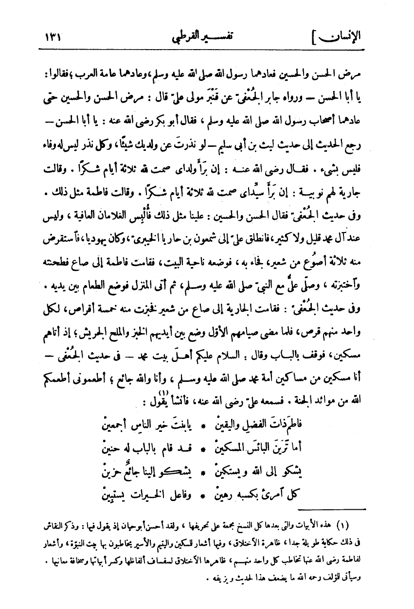 مَرِضَ الْحَسَنُ وَالْحُسَيْنُ فَعَادَهُمَا رَسُولُ اللَّهِ صَلَّى اللَّهُ عَلَيْهِ وَسَلَّمَ، وَعَادَهُمَا عَامَّةُ الْعَرَبِ، فَقَالُوا: يَا أَبَا الْحَسَنِ- وَرَوَاهُ جَابِرٌ الْجُعْفِيُّ عَنْ قَنْبَرٍ مَوْلَى عَلِيٍّ قَالَ: مَرِضَ الْحَسَنُ وَالْحُسَيْنُ حَتَّى عَادَهُمَا أَصْحَابِ رَسُولِ اللَّهِ صَلَّى اللَّهُ عَلَيْهِ وَسَلَّمَ، فَقَالَ أَبُو بَكْرٍ رَضِيَ اللَّهُ عَنْهُ: يَا أَبَا الْحَسَنِ- رَجَعَ الْحَدِيثُ إِلَى حَدِيثِ لَيْثِ بْنِ أَبِي سُلَيْمٍ- لَوْ نَذَرْتَ عَنْ وَلَدَيْكَ شَيْئًا، وَكُلُّ نَذْرٍ لَيْسَ لَهُ وَفَاءٌ فَلَيْسَ بِشَيْءٍ. فَقَالَ رَضِيَ اللَّهُ عَنْهُ: إِنْ بَرَأَ وَلَدَايَ صُمْتُ لِلَّهِ ثَلَاثَةَ أَيَّامٍ شُكْرًا. وَقَالَتْ جَارِيَةٌ لَهُمْ نُوبِيَّةٌ: إِنْ بَرَأَ سَيِّدَايَ صُمْتُ لِلَّهِ ثَلَاثَةَ أَيَّامٍ شُكْرًا. وَقَالَتْ فَاطِمَةُ مِثْلَ ذَلِكَ. وَفِي حَدِيثِ الْجُعْفِيِّ فَقَالَ الْحَسَنُ وَالْحُسَيْنُ: عَلَيْنَا مِثْلَ ذَلِكَ فَأُلْبِسَ الْغُلَامَانِ الْعَافِيَةَ، وَلَيْسَ عِنْدَ آلِ مُحَمَّدٍ قَلِيلٌ وَلَا كَثِيرٌ، فَانْطَلَقَ عَلِيٌّ إِلَى شَمْعُونِ بْنِ حَارِيًا الْخَيْبَرِيِّ، وَكَانَ يَهُودِيًّا، فَاسْتَقْرَضَ مِنْهُ ثَلَاثَةَ أَصْوُعٍ مِنْ شَعِيرٍ، فَجَاءَ بِهِ، فَوَضَعَهُ نَاحِيَةَ الْبَيْتِ، فَقَامَتْ فَاطِمَةُ إِلَى صَاعٍ فَطَحَنَتْهُ وَاخْتَبَزَتْهُ، وَصَلَّى عَلِيٌّ مَعَ النَّبِيِّ صَلَّى اللَّهُ عَلَيْهِ وَسَلَّمَ، ثُمَّ أَتَى الْمَنْزِلَ فَوُضِعَ الطَّعَامُ بَيْنَ يَدَيْهِ. وَفِي حَدِيثِ الْجُعْفِيِّ: فَقَامَتِ الْجَارِيَةُ إِلَى صَاعٍ مِنْ شَعِيرٍ فَخَبَزَتْ مِنْهُ خَمْسَةَ أَقْرَاصٍ، لِكُلِّ وَاحِدٍ مِنْهُمْ قُرْصٌ، فَلَمَّا مَضَى صِيَامُهُمُ الْأَوَّلُ وُضِعَ بَيْنَ أَيْدِيهِمُ الْخُبْزُ وَالْمِلْحُ الْجَرِيشُ، إِذْ أَتَاهُمْ مِسْكِينٌ، فَوَقَفَ بِالْبَابِ وَقَالَ: السَّلَامُ عَلَيْكُمْ أَهْلَ بَيْتِ مُحَمَّدٍ- فِي حَدِيثِ الْجُعْفِيِّ- أَنَا مِسْكِينٌ مِنْ مَسَاكِينَ أُمَّةِ مُحَمَّدٍ صَلَّى اللَّهُ عَلَيْهِ وَسَلَّمَ، وَأَنَا وَاللَّهِ جَائِعٌ، أَطْعِمُونِي أَطْعَمَكُمُ اللَّهُ مِنْ مَوَائِدِ الْجَنَّةِ. فَسَمِعَهُ عَلِيٌّ رَضِيَ اللَّهُ عَنْهُ، فَأَنْشَأَ «١» يَقُولُ: