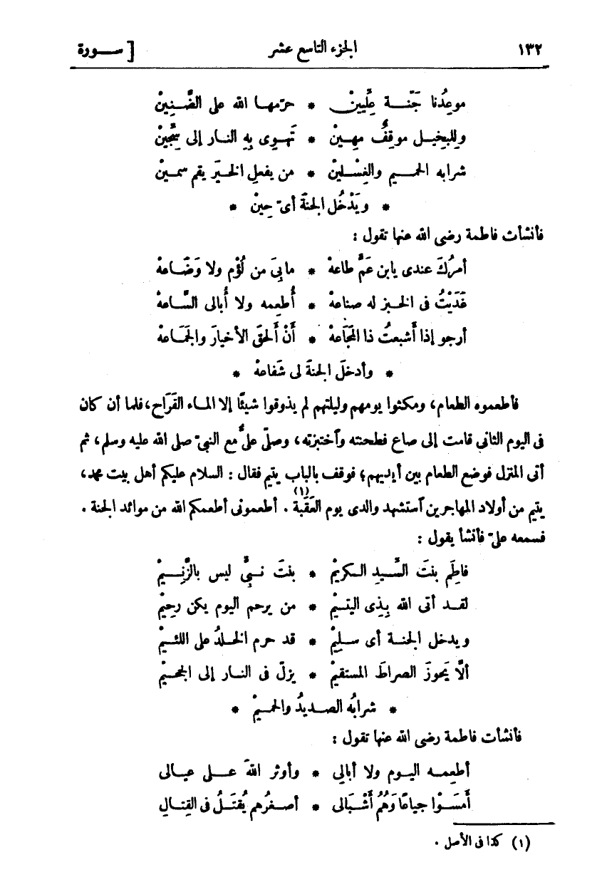 فَأَطْعَمُوهُ الطَّعَامَ، وَمَكَثُوا يَوْمَهُمْ وَلَيْلَتَهُمْ لَمْ يَذُوقُوا شَيْئًا إِلَّا الْمَاءَ الْقَرَاحَ، فَلَمَّا أَنْ كَانَ فِي الْيَوْمِ الثَّانِي قَامَتْ إِلَى صَاعٍ فَطَحَنَتْهُ وَاخْتَبَزَتْهُ، وَصَلَّى عَلِيٌّ مَعَ النَّبِيِّ صَلَّى اللَّهُ عَلَيْهِ وَسَلَّمَ، ثُمَّ أَتَى الْمَنْزِلَ فَوُضِعَ الطَّعَامُ بَيْنَ أَيْدِيهِمْ، فَوَقَفَ بِالْبَابِ يَتِيمٌ فَقَالَ: السَّلَامُ عَلَيْكُمْ أَهْلَ بَيْتِ مُحَمَّدٍ، يَتِيمٌ مِنْ أَوْلَادِ الْمُهَاجِرِينَ اسْتُشْهِدَ وَالِدِي يَوْمَ الْعَقَبَةِ «١». أَطْعِمُونِي أَطْعَمَكُمُ اللَّهُ مِنْ مَوَائِدَ الْجَنَّةِ. فَسَمِعَهُ عَلِيٌّ فَأَنْشَأَ يَقُولُ: