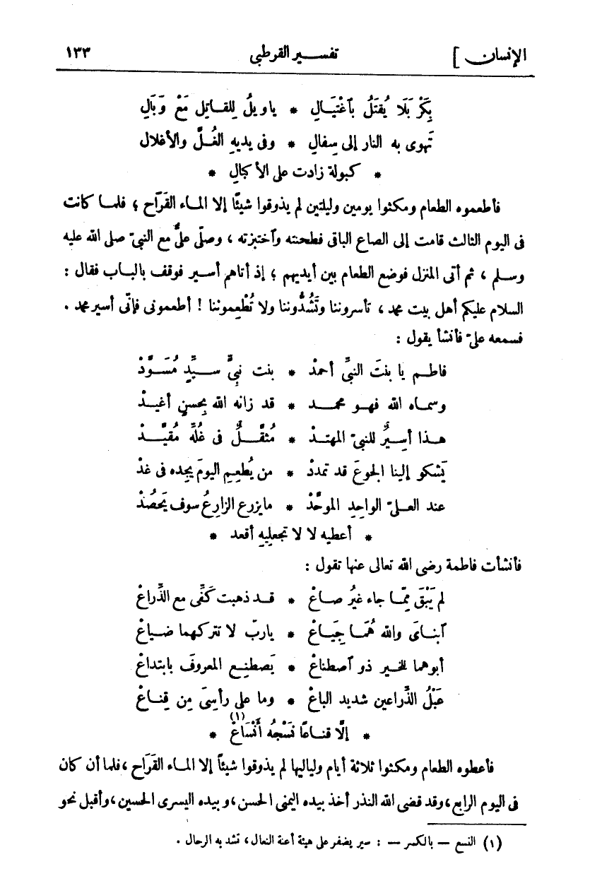 فَأَطْعَمُوهُ الطَّعَامَ وَمَكَثُوا يَوْمَيْنِ وَلَيْلَتَيْنِ لَمْ يَذُوقُوا شَيْئًا إِلَّا الْمَاءَ الْقَرَاحَ، فَلَمَّا كَانَتْ فِي الْيَوْمِ الثَّالِثِ قَامَتْ إِلَى الصَّاعِ الْبَاقِي فَطَحَنَتْهُ وَاخْتَبَزَتْهُ، وَصَلَّى عَلِيٌّ مَعَ النَّبِيِّ صَلَّى اللَّهُ عَلَيْهِ وَسَلَّمَ، ثُمَّ أَتَى الْمَنْزِلَ، فَوُضِعَ الطَّعَامُ بَيْنَ أَيْدِيهِمْ، إِذْ أَتَاهُمْ أَسِيرٌ فَوَقَفَ بِالْبَابِ فَقَالَ: السَّلَامُ عَلَيْكُمْ أَهْلَ بَيْتِ مُحَمَّدٍ، تَأْسِرُونَنَا وَتَشُدُّونَنَا وَلَا تُطْعِمُونَنَا! أَطْعِمُونِي فَإِنِّي أَسِيرُ مُحَمَّدٍ. فَسَمِعَهُ عَلِيٌّ فَأَنْشَأَ يَقُولُ:
