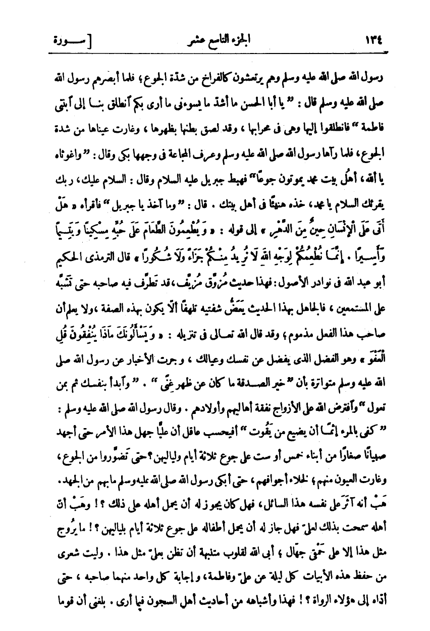 رَسُولِ اللَّهِ صَلَّى اللَّهُ عَلَيْهِ وَسَلَّمَ وَهُمْ يَرْتَعِشُونَ كَالْفِرَاخِ مِنْ شِدَّةِ الْجُوعِ، فَلَمَّا أَبْصَرَهُمْ رسول الله صَلَّى اللَّهُ عَلَيْهِ وَسَلَّمَ قال: [يَا أَبَا الْحَسَنِ مَا أَشَدَّ مَا يَسُوءُنِي مَا أَرَى بِكُمُ انْطَلِقْ بِنَا إِلَى ابْنَتِي فَاطِمَةَ [فَانْطَلَقُوا إِلَيْهَا وَهِيَ فِي مِحْرَابِهَا، وَقَدْ لَصِقَ بَطْنُهَا بِظَهْرِهَا، وَغَارَتْ عَيْنَاهَا مِنْ شِدَّةِ الْجُوعِ، فَلَمَّا رَآهَا رَسُولُ اللَّهِ صَلَّى اللَّهُ عَلَيْهِ وَسَلَّمَ وَعُرِفَ الْمَجَاعَةَ فِي وَجْهِهَا بَكَى وقال: [وا غوثاه يَا اللَّهُ، أَهْلُ بَيْتِ مُحَمَّدٍ يَمُوتُونَ جُوعًا [فَهَبَطَ جِبْرِيلُ عَلَيْهِ السَّلَامُ وَقَالَ: السَّلَامُ عَلَيْكَ، رَبُّكَ يُقْرِئُكَ السَّلَامَ يَا مُحَمَّدُ، خُذْهُ هَنِيئًا فِي أَهْلِ بَيْتِكَ. قَالَ: (وَمَا آخُذُ يَا جِبْرِيلُ) فَأَقْرَأهُ هَلْ أَتى عَلَى الْإِنْسانِ حِينٌ مِنَ الدَّهْرِ إِلَى قَوْلِهِ: وَيُطْعِمُونَ الطَّعامَ عَلى حُبِّهِ مِسْكِيناً وَيَتِيماً وَأَسِيراً. إِنَّما نُطْعِمُكُمْ لِوَجْهِ اللَّهِ لَا نُرِيدُ مِنْكُمْ جَزاءً وَلا شُكُوراً قَالَ التِّرْمِذِيُّ الْحَكِيمُ أَبُو عَبْدِ اللَّهِ فِي نَوَادِرِ الْأُصُولِ: فَهَذَا حَدِيثٌ مُزَوَّقٌ مُزَيَّفٌ، قَدْ تَطَرَّفَ فِيهِ صَاحِبُهُ حَتَّى تَشَبَّهَ عَلَى الْمُسْتَمِعِينَ، فَالْجَاهِلُ بِهَذَا الْحَدِيثِ يَعَضُّ شَفَتَيْهِ تَلَهُّفًا أَلَّا يَكُونَ بِهَذِهِ الصِّفَةِ، وَلَا يَعْلَمُ أَنَّ صَاحِبَ هَذَا الْفِعْلِ مَذْمُومٌ، وَقَدْ قَالَ اللَّهُ تَعَالَى في تنزيله: وَيَسْئَلُونَكَ ماذا يُنْفِقُونَ قُلِ الْعَفْوَ [البقرة: ٢١٩] وَهُوَ الْفَضْلُ الَّذِي يَفْضُلُ عَنْ نَفْسِكَ وَعِيَالِكَ، وَجَرَتِ الْأَخْبَارُ عَنْ رَسُولِ اللَّهِ صَلَّى اللَّهُ عَلَيْهِ وَسَلَّمَ مُتَوَاتِرَةً بِأَنَّ [خَيْرُ الصَّدَقَةِ مَا كَانَ عَنْ ظَهْرِ غِنًى]. [وَابْدَأْ بِنَفْسِكَ ثُمَّ بِمَنْ تَعُولُ] وَافْتَرَضَ اللَّهُ عَلَى الْأَزْوَاجِ نَفَقَةَ أَهَالِيهِمْ وَأَوْلَادِهِمْ. وَقَالَ رَسُولُ اللَّهِ صَلَّى اللَّهُ عَلَيْهِ وَسَلَّمَ: [كَفَى بِالْمَرْءِ إِثْمًا أَنْ يُضَيِّعَ مَنْ يَقُوتُ] أَفَيَحْسَبُ عَاقِلٌ أَنَّ عَلِيًّا جَهِلَ هَذَا الْأَمْرَ حَتَّى أَجْهَدَ صِبْيَانًا صِغَارًا مِنْ أَبْنَاءِ خَمْسٍ أَوْ سِتٍّ عَلَى جُوعِ ثَلَاثَةَ أَيَّامٍ وَلَيَالِيَهُنَّ؟ حَتَّى تَضَوَّرُوا مِنَ الْجُوعِ، وَغَارَتِ الْعُيُونُ مِنْهُمْ، لِخَلَاءِ أَجْوَافِهِمْ، حَتَّى أَبْكَى رَسُولَ اللَّهِ صَلَّى اللَّهُ عَلَيْهِ وَسَلَّمَ مَا بِهِمْ مِنَ الْجَهْدِ. هَبْ أَنَّهُ آثَرَ عَلَى نَفْسِهِ هَذَا السَّائِلَ، فَهَلْ كَانَ يَجُوزُ لَهُ أَنْ يَحْمِلَ أَهْلَهُ عَلَى ذَلِكَ؟! وَهَبْ أَنَّ أَهْلَهُ سَمَحَتْ بِذَلِكَ لِعَلِيٍّ فَهَلْ جَازَ لَهُ أَنْ يَحْمِلَ أَطْفَالَهُ عَلَى جُوعٍ ثَلَاثَةَ أَيَّامٍ بِلَيَالِيِهِنَّ؟! مَا يُرَوَّجُ مِثْلَ هَذَا إِلَّا عَلَى حَمْقَى جُهَّالٍ، أَبَى اللَّهُ لِقُلُوبٍ مُتَنَبِّهَةٍ أَنْ تَظُنَّ بِعَلِيٍّ مِثْلَ هَذَا. وَلَيْتَ شِعْرِي مَنْ حَفِظَ هَذِهِ الْأَبْيَاتَ كُلَّ لَيْلَةٍ عَنْ عَلِيٍّ وَفَاطِمَةَ، وَإِجَابَةَ كُلٍّ وَاحِدٍ مِنْهُمَا صَاحِبَهُ، حَتَّى أَدَّاهُ إِلَى هَؤُلَاءِ الرُّوَاةِ؟ فَهَذَا وَأَشْبَاهُهُ مِنْ أَحَادِيثِ أَهْلِ السُّجُونِ فِيمَا أَرَى. بَلَغَنِي أَنَّ قَوْمًا