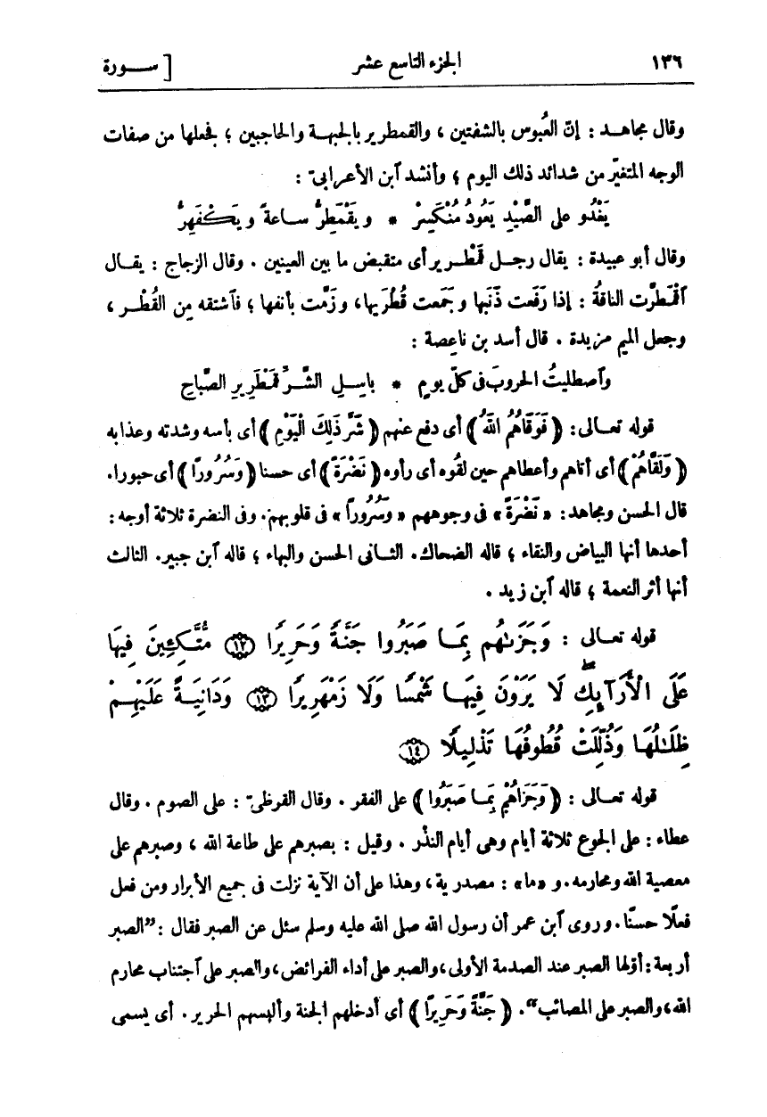 قَوْلُهُ تَعَالَى: (وَجَزاهُمْ بِما صَبَرُوا) عَلَى الْفَقْرِ. وَقَالَ الْقُرَظِيُّ: عَلَى الصَّوْمِ. وَقَالَ عَطَاءٌ: عَلَى الْجُوعِ ثَلَاثَةَ أَيَّامٍ وَهِيَ أَيَّامُ النَّذْرِ. وَقِيلَ: بِصَبْرِهِمْ عَلَى طَاعَةِ اللَّهِ، وَصَبْرِهِمْ عَلَى مَعْصِيَةِ الله ومحارمه. وبِما: مَصْدَرِيَّةٌ، وَهَذَا عَلَى أَنَّ الْآيَةَ نَزَلَتْ فِي جَمِيعِ الْأَبْرَارِ وَمَنْ فَعَلَ فِعْلًا حَسَنًا. وَرَوَى «١» ابْنِ عُمَرَ أَنَّ رَسُولَ اللَّهِ صَلَّى اللَّهُ عَلَيْهِ وَسَلَّمَ سُئِلَ عَنِ الصَّبْرِ فَقَالَ: (الصَّبْرُ أَرْبَعَةٌ: أَوَّلُهَا الصَّبْرُ عِنْدَ الصَّدْمَةِ الْأُولَى، وَالصَّبْرُ عَلَى أَدَاءِ الْفَرَائِضِ، وَالصَّبْرُ عَلَى اجْتِنَابِ مَحَارِمِ اللَّهِ، وَالصَّبْرُ عَلَى الْمَصَائِبِ (. (جَنَّةً وَحَرِيراً) أَيْ أدخلهم الجنة وألبسهم الحرير. أي يسمى