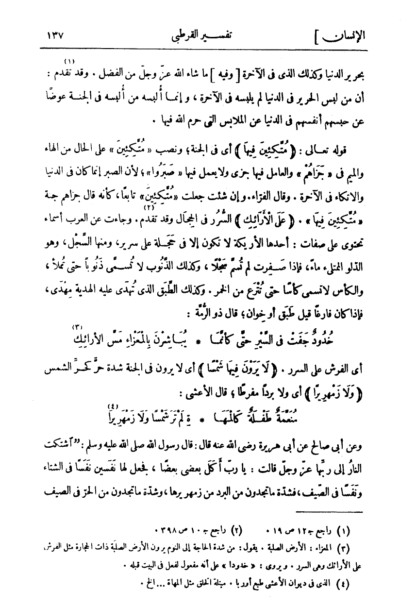 بِحَرِيرِ الدُّنْيَا وَكَذَلِكَ الَّذِي فِي الْآخِرَةِ [وَفِيهِ] مَا شَاءَ اللَّهُ عَزَّ وَجَلَّ مِنَ الْفَضْلِ. وَقَدْ تَقَدَّمَ «١»: أَنَّ مَنْ لَبِسَ الْحَرِيرَ فِي الدُّنْيَا لَمْ يَلْبَسْهُ فِي الْآخِرَةِ، وَإِنَّمَا أُلْبِسَهُ مَنْ أُلْبِسَهُ فِي الْجَنَّةِ عِوَضًا عَنْ حَبْسِهِمْ أَنْفُسَهُمْ فِي الدُّنْيَا عَنِ الْمَلَابِسِ الَّتِي حَرَّمَ اللَّهُ فِيهَا. قَوْلُهُ تَعَالَى: (مُتَّكِئِينَ فِيها) أَيْ فِي الْجَنَّةِ، وَنَصْبُ مُتَّكِئِينَ عَلَى الْحَالِ مِنَ الْهَاءِ وَالْمِيمِ فِي جَزاهُمْ وَالْعَامِلُ فِيهَا جَزَى وَلَا يَعْمَلُ فِيهَا صَبَرُوا، لِأَنَّ الصَّبْرَ إِنَّمَا كَانَ فِي الدُّنْيَا وَالِاتِّكَاءُ فِي الْآخِرَةِ. وَقَالَ الْفَرَّاءُ. وَإِنْ شِئْتَ جَعَلْتَ مُتَّكِئِينَ تَابِعًا، كَأَنَّهُ قَالَ جَزَاهُمْ جَنَّةً مُتَّكِئِينَ فِيها. (عَلَى الْأَرائِكِ) السُّرُرِ فِي الْحِجَالِ وَقَدْ تَقَدَّمَ «٢». وَجَاءَتْ عَنِ الْعَرَبِ أَسْمَاءٌ تَحْتَوِي عَلَى صِفَاتٍ: أَحَدُهَا الْأَرِيكَةُ لَا تَكُونُ إِلَّا فِي حَجَلَةٍ عَلَى سَرِيرٍ، وَمِنْهَا السَّجْلُ، وَهُوَ الدَّلْوُ الْمُمْتَلِئُ مَاءً، فَإِذَا صَفِرَتْ لَمْ تُسَمَّ سَجْلًا، وَكَذَلِكَ الذَّنُوبُ لَا تُسَمَّى ذَنُوبًا حَتَّى تُمْلَأَ، وَالْكَأْسُ لَا تُسَمَّى كَأْسًا حَتَّى تُتْرَعَ مِنَ الْخَمْرِ. وَكَذَلِكَ الطَّبَقُ الَّذِي تُهْدَى عَلَيْهِ الْهَدِيَّةُ مِهْدًى، فَإِذَا كَانَ فَارِغًا قِيلَ طَبَقٌ أَوْ خِوَانٌ، قَالَ ذُو الرُّمَّةِ: