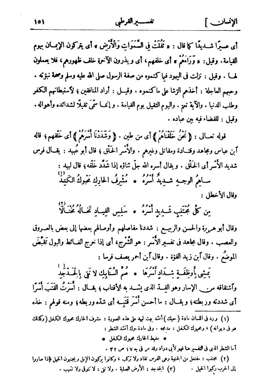 وَقَالَ أَبُو هُرَيْرَةَ وَالْحَسَنُ وَالرَّبِيعُ: شَدَدْنَا مَفَاصِلَهُمْ وَأَوْصَالَهُمْ بَعْضَهَا إِلَى بَعْضٍ بِالْعُرُوقِ وَالْعَصَبِ. وَقَالَ مُجَاهِدٌ فِي تَفْسِيرِ الْأَسْرِ: هُوَ الشَّرْجُ، أَيْ إِذَا خَرَجَ الْغَائِطُ وَالْبَوْلُ تَقَبَّضَ الْمَوْضِعُ. وَقَالَ ابْنُ زَيْدٍ الْقُوَّةُ. وَقَالَ ابْنُ أَحْمَرَ يَصِفُ فَرَسًا: