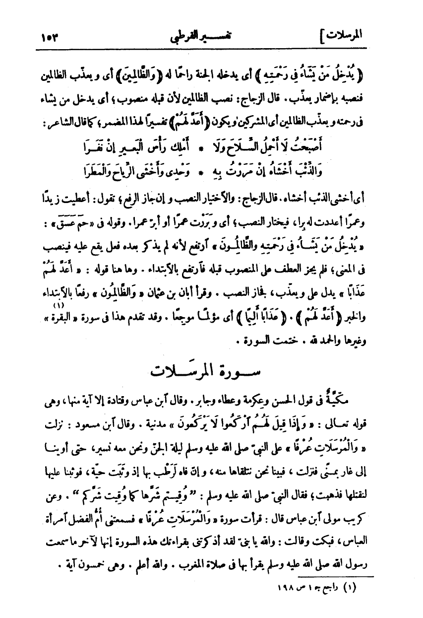 سُورَةُ الْمُرْسَلَاتِ مَكِّيَّةٌ فِي قَوْلِ الْحَسَنِ وَعِكْرِمَةَ وَعَطَاءٍ وَجَابِرٍ. وَقَالَ ابْنُ عَبَّاسٍ وَقَتَادَةُ إِلَّا آيَةً مِنْهَا، وَهِيَ قَوْلُهُ تَعَالَى: وَإِذا قِيلَ لَهُمُ ارْكَعُوا لا يَرْكَعُونَ [المرسلات: ٤٨] مَدَنِيَّةٌ. وَقَالَ ابْنُ مَسْعُودٍ: نَزَلَتْ وَالْمُرْسَلاتِ عُرْفاً عَلَى النَّبِيِّ صَلَّى اللَّهُ عَلَيْهِ وَسَلَّمَ لَيْلَةَ الْجِنِّ وَنَحْنُ مَعَهُ نَسِيرُ، حَتَّى أَوَيْنَا إِلَى غَارٍ بِمِنًى فَنَزَلَتْ، فَبَيْنَا نَحْنُ نَتَلَقَّاهَا مِنْهُ، وَإِنَّ فَاهُ لَرَطْبٌ بِهَا إِذْ وَثَبَتْ حَيَّةٌ، فَوَثَبْنَا عَلَيْهَا لِنَقْتُلَهَا فَذَهَبَتْ، فَقَالَ النَّبِيُّ صَلَّى اللَّهُ عَلَيْهِ وَسَلَّمَ: (وُقِيتُمْ شَرَّهَا كَمَا وُقِيَتْ شَرَّكُمْ). وَعَنْ كُرَيْبٍ مَوْلَى ابْنِ عَبَّاسٍ قَالَ: قَرَأْتُ سُورَةَ وَالْمُرْسَلاتِ عُرْفاً فَسَمِعَتْنِي أُمُّ الْفَضْلِ امْرَأَةُ الْعَبَّاسِ، فَبَكَتْ وَقَالَتْ: وَاللَّهِ يَا بُنَيَّ لَقَدْ أَذْكَرْتَنِي بِقِرَاءَتِكَ هَذِهِ السُّورَةَ إِنَّهَا لَآخِرُ مَا سَمِعْتُ رَسُولَ اللَّهِ صَلَّى اللَّهُ عَلَيْهِ وَسَلَّمَ يَقْرَأُ بِهَا فِي صَلَاةِ الْمَغْرِبِ. وَاللَّهُ أعلم. وهي خمسون آية.