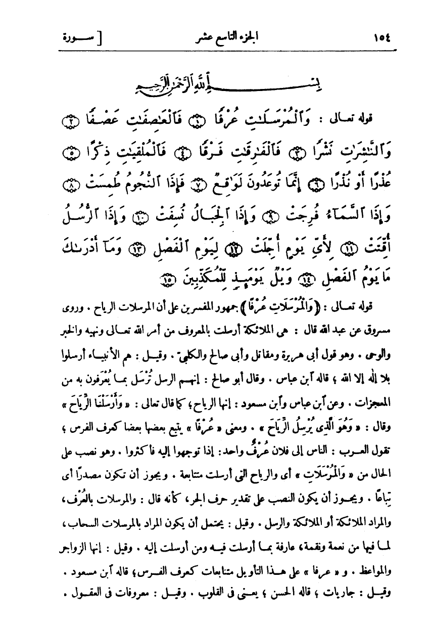 جُمْهُورُ الْمُفَسِّرِينَ عَلَى أَنَّ الْمُرْسَلَاتِ الرِّيَاحُ. وَرَوَى مَسْرُوقٌ عَنْ عَبْدِ اللَّهِ قَالَ: هِيَ الْمَلَائِكَةُ أُرْسِلَتْ بِالْمَعْرُوفِ مِنْ أَمْرِ اللَّهِ تَعَالَى وَنَهْيِهِ وَالْخَبَرِ وَالْوَحْيِ. وَهُوَ قَوْلُ أَبِي هُرَيْرَةَ وَمُقَاتِلٍ وَأَبِي صَالِحٍ وَالْكَلْبِيِّ. وَقِيلَ: هُمُ الْأَنْبِيَاءُ أُرْسِلُوا بِلَا إِلَهَ إِلَّا اللَّهُ، قَالَهُ ابْنُ عَبَّاسٍ. وَقَالَ أَبُو صَالِحٍ: إِنَّهُمُ الرُّسُلُ تُرْسَلُ بِمَا يُعْرَفُونَ بِهِ مِنَ الْمُعْجِزَاتِ. وَعَنِ ابْنِ عَبَّاسٍ وَابْنِ مَسْعُودٍ: أَنَّهَا الرِّيَاحُ، كَمَا قَالَ تَعَالَى: وَأَرْسَلْنَا الرِّياحَ [الحجر: ٢٢]. وقال: وَهُوَ الَّذِي يُرْسِلُ الرِّياحَ [الأعراف: ٥٧]. وَمَعْنَى عُرْفاً يَتْبَعُ بَعْضُهَا بَعْضًا كَعُرْفِ الْفَرَسِ، تَقُولُ الْعَرَبُ: النَّاسُ إِلَى فُلَانٍ عُرْفٌ وَاحِدٌ: إِذَا تَوَجَّهُوا إِلَيْهِ فَأَكْثَرُوا. وَهُوَ نَصْبٌ عَلَى الْحَالِ مِنْ وَالْمُرْسَلاتِ أَيْ وَالرِّيَاحِ الَّتِي أُرْسِلَتْ مُتَتَابِعَةً. وَيَجُوزُ أَنْ تَكُونَ مَصْدَرًا أَيْ تِبَاعًا. وَيَجُوزُ أَنْ يَكُونَ النَّصْبُ عَلَى تَقْدِيرِ حَرْفِ الْجَرِّ، كَأَنَّهُ قَالَ: وَالْمُرْسَلَاتُ بِالْعُرْفِ، وَالْمُرَادُ الْمَلَائِكَةُ أَوِ الْمَلَائِكَةُ وَالرُّسُلُ. وَقِيلَ: يُحْتَمَلُ أَنْ يَكُونَ الْمُرَادُ بِالْمُرْسَلَاتِ السَّحَابُ، لِمَا فِيهَا مِنْ نِعْمَةٍ وَنِقْمَةٍ، عَارِفَةٌ بِمَا أُرْسِلَتْ فِيهِ وَمَنْ أُرْسِلَتْ إليه. وقيل: إنها الزواجر والمواعظ. وعُرْفاً عَلَى هَذَا التَّأْوِيلِ مُتَتَابِعَاتٌ كَعُرْفِ الْفَرَسِ، قَالَهُ ابْنُ مَسْعُودٍ. وَقِيلَ: جَارِيَاتٌ، قَالَهُ الْحَسَنُ، يَعْنِي فِي الْقُلُوبِ. وَقِيلَ: مَعْرُوفَاتٌ فِي الْعُقُولِ.
