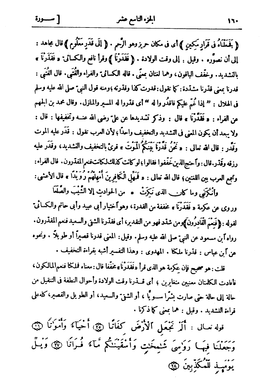 وَرُوِيَ عَنْ عِكْرِمَةَ فَقَدَرْنا مُخَفَّفَةً مِنَ الْقُدْرَةِ، وَهُوَ اخْتِيَارُ أَبِي عُبَيْدٍ وَأَبِي حَاتِمٍ وَالْكِسَائِيِّ لِقَوْلِهِ: فَنِعْمَ الْقادِرُونَ وَمَنْ شَدَّدَ فَهُوَ مِنَ التَّقْدِيرِ، أَيْ فَقَدَّرْنَا الشَّقِيَّ وَالسَّعِيدَ فَنِعْمَ الْمُقَدِّرُونَ. رَوَاهُ ابْنِ مَسْعُودٍ عَنِ النَّبِيِّ صَلَّى اللَّهُ عَلَيْهِ وَسَلَّمَ. وَقِيلَ: الْمَعْنَى قَدَّرْنَا قَصِيرًا أَوْ طَوِيلًا. وَنَحْوَهُ عَنِ ابْنِ عَبَّاسٍ: قَدَّرْنَا مُلْكَنَا. الْمَهْدَوِيُّ: وَهَذَا التَّفْسِيرُ أَشْبَهُ بِقِرَاءَةِ التَّخْفِيفِ. قُلْتُ: هُوَ صَحِيحٌ فَإِنَّ عِكْرِمَةَ هُوَ الَّذِي قَرَأَ فَقَدَرْنا مُخَفَّفًا قَالَ: مَعْنَاهُ فَمَلَكْنَا فَنِعْمَ الْمَالِكُونَ، فَأَفَادَتِ الْكَلِمَتَانِ مَعْنَيَيْنِ مُتَغَايِرَيْنِ، أَيْ قَدَرْنَا وَقْتَ الْوِلَادَةِ وَأَحْوَالَ النُّطْفَةِ فِي التَّنْقِيلِ مِنْ حَالَةٍ إِلَى حَالَةٍ حَتَّى صَارَتْ بَشَرًا سَوِيًّا، أَوِ الشَّقِيَّ وَالسَّعِيدَ، أَوِ الطَّوِيلَ وَالْقَصِيرَ، كُلُّهُ عَلَى قِرَاءَةِ التَّشْدِيدِ. وقيل: هما بمعنى كما ذكرنا.