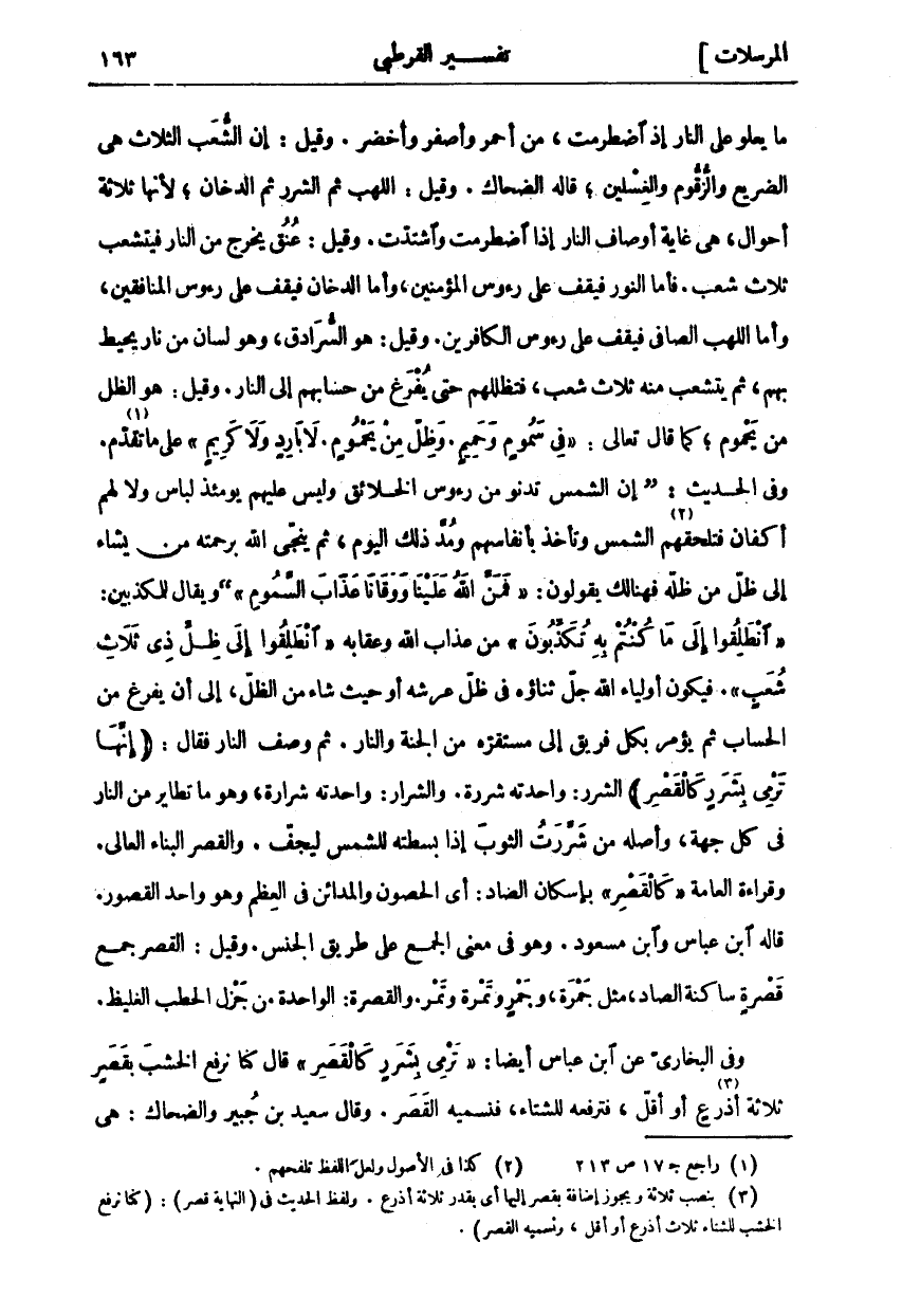 مَا يَعْلُو عَلَى النَّارِ إِذِ اضْطَرَمَتْ مِنْ أَحْمَرَ وَأَصْفَرَ وَأَخْضَرَ. وَقِيلَ: إِنَّ الشُّعَبَ الثَّلَاثَ هِيَ الضَّرِيعُ وَالزَّقُّومُ وَالْغِسْلِينُ، قَالَهُ الضَّحَّاكُ. وَقِيلَ: اللَّهَبُ ثُمَّ الشَّرَرُ ثُمَّ الدُّخَانُ، لِأَنَّهَا ثَلَاثَةُ أَحْوَالٍ، هِيَ غَايَةُ أَوْصَافِ النَّارِ إِذَا اضْطَرَمَتْ وَاشْتَدَّتْ. وَقِيلَ: عُنُقٌ يَخْرُجُ مِنَ النَّارِ فَيَتَشَعَّبُ ثلاث شعب. فأما النور فيقف على رءوس المؤمنين، وأما الدخان فيقف على رءوس المنافقين، وأما اللهب الصافي فيقف على رءوس الْكَافِرِينَ. وَقِيلَ: هُوَ السُّرَادِقُ، وَهُوَ لِسَانٌ مِنْ نَارٍ يُحِيطُ بِهِمْ، ثُمَّ يَتَشَعَّبُ مِنْهُ ثَلَاثُ شُعَبٍ، فَتُظَلِّلُهُمْ حَتَّى يُفْرَغَ مِنْ حِسَابِهِمْ إِلَى النَّارِ. وَقِيلَ: هُوَ الظِّلُّ مِنْ يَحْمُومٍ، كَمَا قَالَ تَعَالَى: فِي سَمُومٍ وَحَمِيمٍ. وَظِلٍّ مِنْ يَحْمُومٍ. لَا بارِدٍ وَلا كَرِيمٍ [الواقعة: ٤٤ - ٤٢] عَلَى مَا تَقَدَّمَ «١». وَفِي الْحَدِيثِ: (إِنَّ الشَّمْسَ تدنو من رءوس الْخَلَائِقِ وَلَيْسَ عَلَيْهِمْ يَوْمَئِذٍ لِبَاسٌ وَلَا لَهُمْ أَكْفَانٌ فَتَلْحَقُهُمُ «٢» الشَّمْسُ وَتَأْخُذُ بِأَنْفَاسِهِمْ وَمُدَّ ذَلِكَ الْيَوْمَ، ثُمَّ يُنَجِّي اللَّهُ بِرَحْمَتِهِ مَنْ يَشَاءُ إِلَى ظِلٍّ مِنْ ظِلِّهِ فَهُنَالِكَ يَقُولُونَ: فَمَنَّ اللَّهُ عَلَيْنا وَوَقانا عَذابَ السَّمُومِ [الطور: ٢٧] وَيُقَالُ لِلْمُكَذِّبِينَ: انْطَلِقُوا إِلى مَا كُنْتُمْ بِهِ تُكَذِّبُونَ مِنْ عَذَابِ اللَّهِ وَعِقَابِهِ انْطَلِقُوا إِلى ظِلٍّ ذِي ثَلاثِ شُعَبٍ. فَيَكُونُ أَوْلِيَاءُ اللَّهِ جَلَّ ثَنَاؤُهُ فِي ظِلِّ عَرْشِهِ أَوْ حَيْثُ شَاءَ مِنَ الظِّلِّ، إِلَى أَنْ يُفْرَغَ مِنَ الْحِسَابِ ثُمَّ يُؤْمَرُ بِكُلِّ فَرِيقٍ إِلَى مُسْتَقَرِّهِ مِنَ الْجَنَّةِ وَالنَّارِ. ثُمَّ وَصَفَ النَّارَ فَقَالَ: إِنَّها تَرْمِي بِشَرَرٍ كَالْقَصْرِ الشَّرَرُ: وَاحِدَتُهُ شَرَرَةٌ. وَالشِّرَارُ: وَاحِدَتُهُ شَرَارَةٌ، وَهُوَ مَا تَطَايَرَ مِنَ النَّارِ فِي كُلِّ جِهَةٍ، وَأَصْلُهُ مِنْ شَرَرْتُ الثَّوْبَ إِذَا بَسَطْتُهُ لِلشَّمْسِ لِيَجِفَّ. وَالْقَصْرُ الْبِنَاءُ الْعَالِي. وَقِرَاءَةُ الْعَامَّةِ كَالْقَصْرِ بِإِسْكَانِ الصَّادِ: أَيِ الْحُصُونِ وَالْمَدَائِنِ فِي الْعِظَمِ وَهُوَ وَاحِدُ الْقُصُورِ. قَالَهُ ابْنُ عَبَّاسٍ وَابْنُ مَسْعُودٍ. وَهُوَ فِي مَعْنَى الْجَمْعِ عَلَى طَرِيقِ الْجِنْسِ. وَقِيلَ: الْقَصْرُ جَمْعُ قَصْرَةٍ سَاكِنَةُ الصَّادِ، مِثْلُ جَمْرَةٍ، وَجَمْرٍ وَتَمْرَةٍ وَتَمْرٍ. وَالْقَصْرَةُ: الْوَاحِدَةُ مِنْ جَزْلِ الْحَطَبِ الْغَلِيظِ. وَفِي الْبُخَارِيِّ عَنِ ابْنِ عَبَّاسٍ أَيْضًا: تَرْمِي بِشَرَرٍ كَالْقَصْرِ قَالَ كُنَّا نَرْفَعُ الْخَشَبَ بِقَصْرِ ثَلَاثَةِ أَذْرُعٍ «٣» أَوْ أَقَلِّ، فَتَرْفَعُهُ لِلشِّتَاءِ، فَنُسَمِّيهِ الْقَصْرَ، وَقَالَ سَعِيدُ بْنُ جُبَيْرٍ وَالضَّحَّاكُ: هي