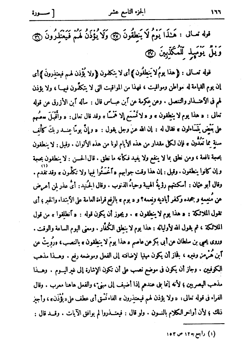 قَوْلُهُ تَعَالَى: (هَذَا يَوْمُ لَا يَنْطِقُونَ) أَيْ لَا يَتَكَلَّمُونَ (وَلا يُؤْذَنُ لَهُمْ فَيَعْتَذِرُونَ) أَيْ إِنَّ يَوْمَ الْقِيَامَةِ لَهُ مَوَاطِنُ وَمَوَاقِيتُ فَهَذَا مِنَ الْمَوَاقِيتِ الَّتِي لَا يَتَكَلَّمُونَ فِيهَا وَلَا يُؤْذَنُ لَهُمْ فِي الِاعْتِذَارِ وَالتَّنَصُّلِ. وَعَنْ عِكْرِمَةَ عَنِ ابْنِ عَبَّاسٍ قال: سأله ابْنُ الْأَزْرَقِ عَنْ قَوْلِهِ تَعَالَى: هَذَا يَوْمُ لا يَنْطِقُونَ وفَلا تَسْمَعُ إِلَّا هَمْساً [طه: ١٠٨] وَقَدْ قَالَ تَعَالَى: وَأَقْبَلَ بَعْضُهُمْ عَلى بَعْضٍ يَتَساءَلُونَ [الصافات: ٢٧] فَقَالَ لَهُ: إِنَّ اللَّهَ عَزَّ وَجَلَّ يَقُولُ: وَإِنَّ يَوْماً عِنْدَ رَبِّكَ كَأَلْفِ سَنَةٍ مِمَّا تَعُدُّونَ [الحج: ٤٧] فَإِنَّ لِكُلِّ مِقْدَارٍ مِنْ هَذِهِ الْأَيَّامِ لَوْنًا مِنْ هَذِهِ الْأَلْوَانِ. وَقِيلَ: لَا يَنْطِقُونَ بِحُجَّةٍ نَافِعَةٍ، وَمَنْ نَطَقَ بِمَا لَا يَنْفَعُ وَلَا يُفِيدُ فَكَأَنَّهُ مَا نَطَقَ. قَالَ الْحَسَنُ: لَا يَنْطِقُونَ بِحُجَّةٍ وَإِنْ كَانُوا يَنْطِقُونَ. وَقِيلَ: إِنَّ هذا وقت جوابهم اخْسَؤُا فِيها وَلا تُكَلِّمُونِ [المؤمنون: ١٠٨] وَقَدْ تَقَدَّمَ «١». وَقَالَ أَبُو عُثْمَانَ: أَسْكَتَتْهُمْ رُؤْيَةُ الْهَيْبَةِ وَحَيَاءُ الذُّنُوبِ. وَقَالَ الْجُنَيْدُ: أَيُّ عُذْرٍ لمن أعر ض عن منعمه وجحده وكفر أياديه ونعمه؟ ويَوْمُ بِالرَّفْعِ قِرَاءَةُ الْعَامَّةِ عَلَى الِابْتِدَاءِ وَالْخَبَرِ، أَيْ تَقُولُ الْمَلَائِكَةُ: هَذَا يَوْمُ لَا يَنْطِقُونَ وَيَجُوزُ أَنْ يَكُونَ قَوْلُهُ: انْطَلِقُوا مِنْ قَوْلِ الْمَلَائِكَةِ، ثُمَّ يَقُولُ اللَّهُ لِأَوْلِيَائِهِ: هَذَا يَوْمٌ لَا يَنْطِقُ الْكُفَّارُ. وَمَعْنَى الْيَوْمِ السَّاعَةُ وَالْوَقْتُ. وَرَوَى يَحْيَى بْنُ سُلْطَانَ. عَنْ أَبِي بَكْرٍ عَنْ عَاصِمٍ هَذَا يَوْمُ لَا يَنْطِقُونَ بِالنَّصْبِ، وَرُوِيَتْ عَنِ ابْنِ هُرْمُزَ وَغَيْرِهِ، فَجَازَ أَنْ يَكُونَ مَبْنِيًّا لِإِضَافَتِهِ إِلَى الْفِعْلِ وَمَوْضِعُهُ رَفْعٌ. وَهَذَا مَذْهَبُ الْكُوفِيِّينَ. وَجَازَ أَنْ يَكُونَ فِي مَوْضِعِ نَصْبٍ عَلَى أَنْ تَكُونَ الْإِشَارَةُ إِلَى غَيْرِ الْيَوْمِ. وَهَذَا مَذْهَبُ الْبَصْرِيِّينَ، لِأَنَّهُ إِنَّمَا بُنِيَ عندهم إذا أضيف إلى مبني، والفعل ها هنا مُعْرَبٌ. وَقَالَ الْفَرَّاءُ فِي قَوْلِهِ تَعَالَى: وَلا يُؤْذَنُ لَهُمْ فَيَعْتَذِرُونَ الْفَاءُ نَسَقٌ أَيْ عَطْفٌ عَلَى يُؤْذَنُ وَأُجِيزَ ذَلِكَ، لِأَنَّ أَوَاخِرَ الْكَلَامِ بِالنُّونِ. وَلَوْ قَالَ: فَيَعْتَذِرُوا لَمْ يُوَافِقِ الْآيَاتِ. وقد قال: