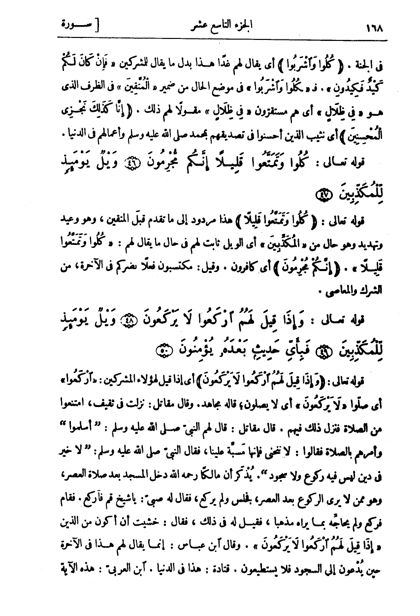 قَوْلُهُ تَعَالَى: (وَإِذا قِيلَ لَهُمُ ارْكَعُوا لَا يَرْكَعُونَ) أَيْ إِذَا قِيلَ لِهَؤُلَاءِ الْمُشْرِكِينَ: ارْكَعُوا أَيْ صَلُّوا لَا يَرْكَعُونَ أَيْ لَا يُصَلُّونَ، قَالَهُ مُجَاهِدٌ. وَقَالَ مُقَاتِلٌ: نَزَلَتْ فِي ثَقِيفٍ، امْتَنَعُوا مِنَ الصَّلَاةِ فَنَزَلَ ذَلِكَ فِيهِمْ. قَالَ مُقَاتِلٌ: قَالَ لَهُمُ النَّبِيُّ صَلَّى اللَّهُ عَلَيْهِ وَسَلَّمَ: (أَسْلِمُوا) وَأَمَرَهُمْ بِالصَّلَاةِ فَقَالُوا: لَا نَنْحَنِي فَإِنَّهَا مَسَبَّةٌ عَلَيْنَا، فَقَالَ النَّبِيُّ صَلَّى اللَّهُ عَلَيْهِ وَسَلَّمَ: [لَا خَيْرَ فِي دِينٍ لَيْسَ فِيهِ رُكُوعٌ وَلَا سُجُودٌ]. يُذْكَرُ أَنَّ مَالِكًا رَحِمَهُ اللَّهُ دَخَلَ الْمَسْجِدَ بَعْدَ صَلَاةِ الْعَصْرِ، وَهُوَ مِمَّنْ لَا يَرَى الرُّكُوعَ بَعْدَ الْعَصْرِ، فَجَلَسَ وَلَمْ يَرْكَعْ، فَقَالَ لَهُ صَبِيٌّ: يَا شَيْخُ قُمْ فَارْكَعْ. فَقَامَ فَرَكَعَ وَلَمْ يُحَاجِّهُ بِمَا يَرَاهُ مَذْهَبًا، فَقِيلَ لَهُ فِي ذَلِكَ، فَقَالَ: خَشِيتُ أَنْ أَكُونَ مِنَ الَّذِينَ إِذا قِيلَ لَهُمُ ارْكَعُوا لَا يَرْكَعُونَ. وَقَالَ ابْنُ عَبَّاسٍ: إِنَّمَا يُقَالُ لَهُمْ هَذَا فِي الْآخِرَةِ حِينَ يُدْعَوْنَ إِلَى السُّجُودِ فَلَا يَسْتَطِيعُونَ. قَتَادَةُ: هَذَا فِي الدُّنْيَا. ابْنُ الْعَرَبِيِّ: هَذِهِ الْآيَةُ