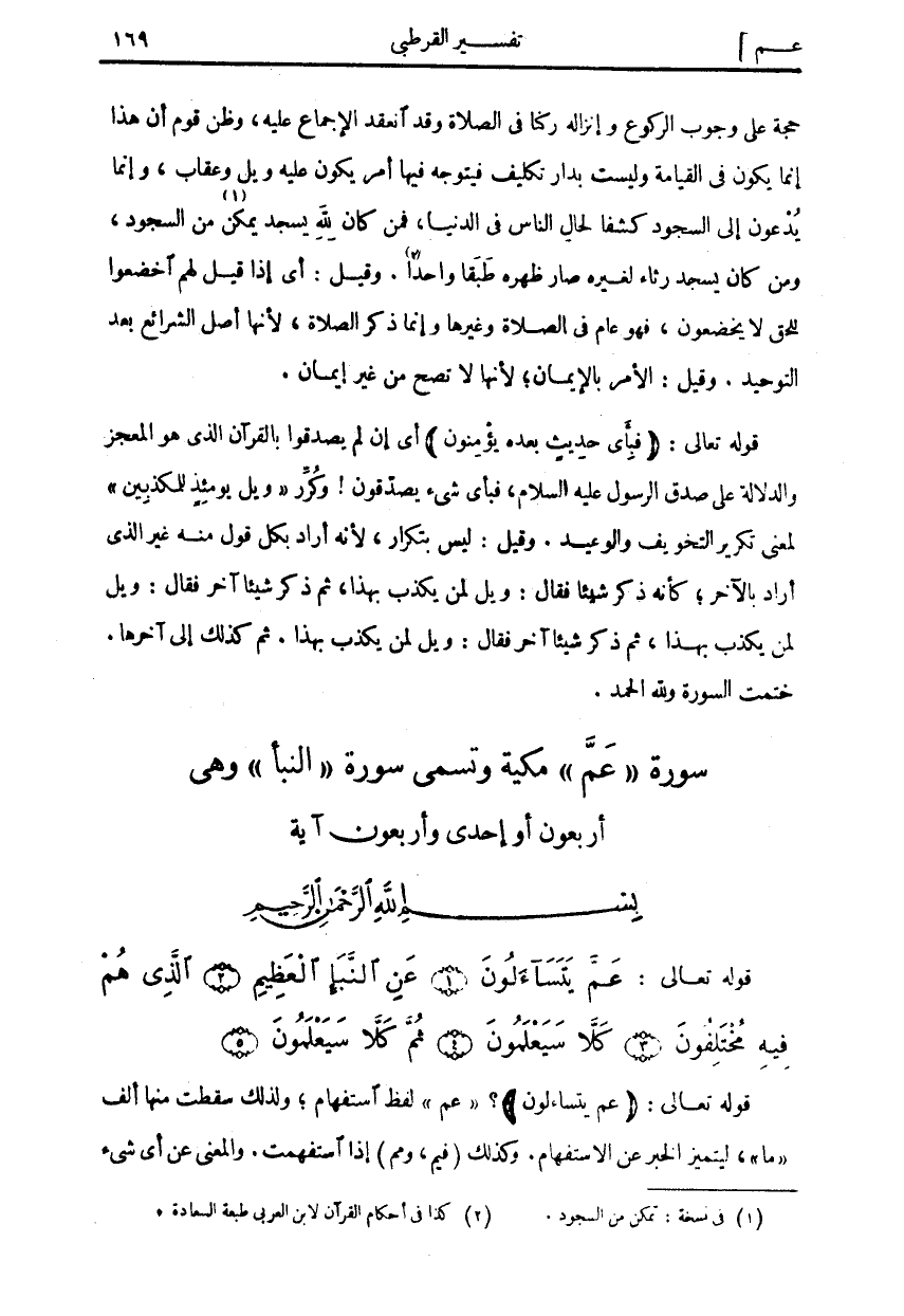 سُورَةُ (عَمَّ) مَكِّيَّةٌ وَتُسَمَّى سُورَةُ (النَّبَأِ) وَهِيَ أَرْبَعُونَ أَوْ إِحْدَى وَأَرْبَعُونَ آيَةً بِسْمِ اللَّهِ الرَّحْمنِ الرَّحِيمِ