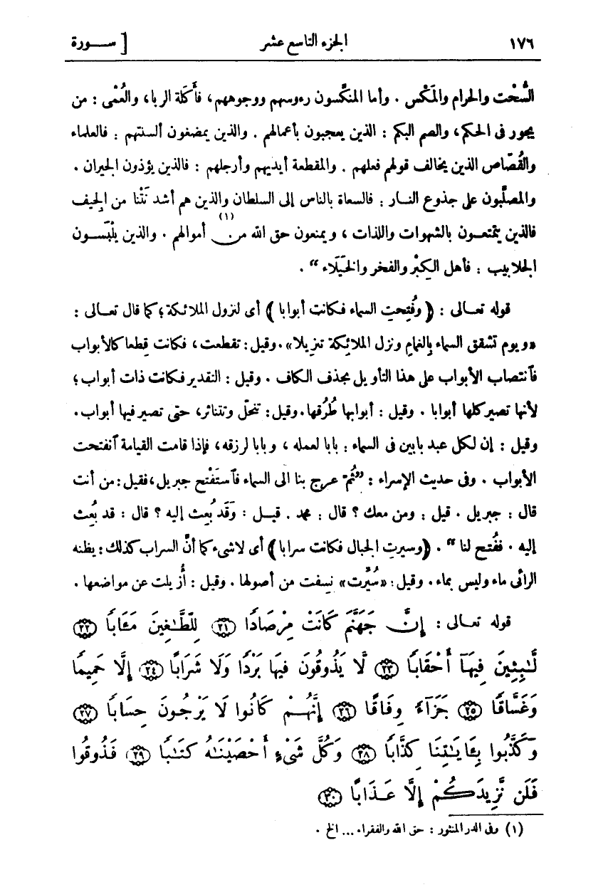 السُّحْتِ وَالْحَرَامِ وَالْمَكْسِ. وَأَمَّا الْمُنَكَّسُونَ رُؤُوسُهُمْ وَوُجُوهُهُمْ، فَأَكَلَةُ الرِّبَا، وَالْعُمْيُ: مَنْ يَجُورُ فِي الْحُكْمِ، وَالصُّمُّ الْبُكْمُ: الَّذِينَ يُعْجَبُونَ بِأَعْمَالِهِمْ. وَالَّذِينَ يَمْضُغُونَ أَلْسِنَتَهُمْ: فَالْعُلَمَاءُ وَالْقُصَّاصُ الَّذِينَ يُخَالِفُ قَوْلُهُمْ فِعْلَهُمْ. وَالْمُقَطَّعَةُ أَيْدِيهِمْ وَأَرْجُلُهُمْ: فَالَّذِينَ يُؤْذُونَ الْجِيرَانَ. وَالْمُصَلَّبُونَ عَلَى جُذُوعِ النَّارِ: فَالسُّعَاةُ بِالنَّاسِ إِلَى السُّلْطَانِ وَالَّذِينَ هُمْ أَشَدُّ نَتْنًا مِنَ الْجِيَفِ فَالَّذِينَ يتمتعون بالشهوات واللذات، ويمنعون حق الله مِنْ «١» أَمْوَالِهِمْ. وَالَّذِينَ يَلْبَسُونَ الْجَلَابِيبَ: فَأَهْلُ الْكِبْرِ وَالْفَخْرِ وَالْخُيَلَاءِ (. قَوْلُهُ تَعَالَى: (وَفُتِحَتِ السَّماءُ فَكانَتْ أَبْواباً) أَيْ لِنُزُولِ الْمَلَائِكَةِ، كَمَا قَالَ تَعَالَى: وَيَوْمَ تَشَقَّقُ السَّماءُ بِالْغَمامِ وَنُزِّلَ الْمَلائِكَةُ تَنْزِيلًا [الفرقان: ٢٥]. وَقِيلَ: تَقَطَّعَتْ، فَكَانَتْ قِطَعًا كَالْأَبْوَابِ فَانْتِصَابُ الْأَبْوَابِ عَلَى هَذَا التَّأْوِيلِ بِحَذْفِ الْكَافِ. وَقِيلَ: التَّقْدِيرُ فَكَانَتْ ذَاتَ أَبْوَابٍ، لِأَنَّهَا تَصِيرُ كُلُّهَا أَبْوَابًا. وَقِيلَ: أَبْوَابُهَا طُرُقُهَا. وَقِيلَ: تَنْحَلُّ وَتَتَنَاثَرُ، حَتَّى تَصِيرَ فِيهَا أَبْوَابٌ. وَقِيلَ: إِنَّ لِكُلِّ عَبْدٍ بَابَيْنِ فِي السَّمَاءِ: بَابًا لِعَمَلِهِ، وَبَابًا لِرِزْقِهِ، فَإِذَا قَامَتِ الْقِيَامَةُ انْفَتَحَتِ الْأَبْوَابُ. وَفِي حَدِيثِ الْإِسْرَاءِ: (ثُمَّ عُرِجَ بِنَا إِلَى السَّمَاءِ فَاسْتَفْتَحَ جِبْرِيلُ، فَقِيلَ: مَنْ أَنْتَ قَالَ: جِبْرِيلُ. قِيلَ: وَمَنْ مَعَكَ؟ قَالَ: مُحَمَّدٌ. قِيلَ: وَقَدْ بُعِثَ إِلَيْهِ؟ قَالَ: قَدْ بُعِثَ إِلَيْهِ. فَفُتِحَ لَنَا (.) (وَسُيِّرَتِ الْجِبالُ فَكانَتْ سَراباً) أي لا شي كَمَا أَنَّ السَّرَابَ كَذَلِكَ: يَظُنُّهُ الرَّائِي مَاءً وَلَيْسَ بِمَاءٍ. وَقِيلَ: سُيِّرَتِ نُسِفَتْ مِنْ أُصُولِهَا. وقيل: أزيلت عن مواضعها.
