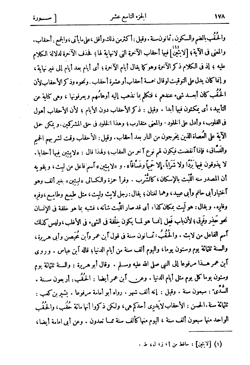 وَالْحُقْبُ بِالضَّمِّ وَالسُّكُونِ: ثَمَانُونَ سَنَةً. وَقِيلَ: أَكْثَرُ مِنْ ذَلِكَ وَأَقَلُّ، عَلَى مَا يَأْتِي، وَالْجَمْعُ: أَحْقَابٌ. وَالْمَعْنَى فِي الْآيَةِ، [لَابِثِينَ «١»] فِيهَا أَحْقَابَ الْآخِرَةِ الَّتِي لَا نِهَايَةَ لَهَا، فَحَذَفَ الْآخِرَةَ لِدَلَالَةِ الْكَلَامِ عَلَيْهِ، إِذْ فِي الْكَلَامِ ذِكْرُ الْآخِرَةِ وَهُوَ كَمَا يُقَالُ أَيَّامُ الْآخِرَةِ، أَيْ أَيَّامٌ بَعْدَ أَيَّامٍ إِلَى غَيْرِ نِهَايَةٍ، وَإِنَّمَا كَانَ يَدُلُّ عَلَى التَّوْقِيتِ لَوْ قَالَ خَمْسَةُ أَحْقَابٍ أَوْ عَشَرَةُ أَحْقَابٍ. وَنَحْوَهُ وَذَكَرَ الْأَحْقَابَ لان الحقب كان أبعد شي عِنْدَهُمْ، فَتَكَلَّمَ بِمَا تَذْهَبُ إِلَيْهِ أَوْهَامُهُمْ وَيَعْرِفُونَهَا، وَهِيَ كِنَايَةٌ عَنِ التَّأْبِيدِ، أَيْ يَمْكُثُونَ فِيهَا أَبَدًا. وَقِيلَ: ذَكَرَ الْأَحْقَابَ دُونَ الْأَيَّامِ، لِأَنَّ الْأَحْقَابَ أَهْوَلُ فِي الْقُلُوبِ، وَأَدَلُّ عَلَى الْخُلُودِ. وَالْمَعْنَى مُتَقَارِبٌ، وَهَذَا الْخُلُودُ فِي حَقِّ الْمُشْرِكِينَ. وَيُمْكِنُ حَمْلُ الْآيَةِ عَلَى الْعُصَاةِ الَّذِينَ يَخْرُجُونَ مِنَ النَّارِ بَعْدَ أَحْقَابٍ. وَقِيلَ: الْأَحْقَابُ وَقْتٌ لِشُرْبِهِمُ الْحَمِيمَ وَالْغَسَّاقَ، فَإِذَا انْقَضَتْ فَيَكُونُ لَهُمْ نَوْعٌ آخَرُ مِنَ الْعِقَابِ، وَلِهَذَا قَالَ: لابِثِينَ فِيها أَحْقاباً. لَا يَذُوقُونَ فِيها بَرْداً وَلا شَراباً. إِلَّا حَمِيماً وَغَسَّاقاً. ولابِثِينَ اسْمُ فَاعِلٍ مِنْ لَبِثَ، وَيُقَوِّيهِ أَنَّ الْمَصْدَرَ مِنْهُ اللُّبْثُ بِالْإِسْكَانِ، كَالشُّرْبِ. وَقَرَأَ حَمْزَةُ وَالْكِسَائِيُّ لابِثِينَ بِغَيْرِ أَلِفٍ وَهُوَ اخْتِيَارُ أَبِي حَاتِمٍ وَأَبِي عُبَيْدٍ، وَهُمَا لُغَتَانِ، يُقَالُ: رَجُلٌ لَابِثٌ وَلَبِثَ، مِثْلُ طَمِعٍ وَطَامِعٍ، وَفَرِهٍ وَفَارِهٍ. وَيُقَالُ: هُوَ لَبِثٌ بِمَكَانِ كَذَا: أَيْ قَدْ صَارَ اللُّبْثُ شَأْنَهُ، فَشُبِّهَ بِمَا هُوَ خِلْقَةٌ فِي الْإِنْسَانِ نَحْوَ حَذِرٌ وَفَرِقٌ، لِأَنَّ بَابَ فَعِلَ إِنَّمَا هُوَ لِمَا يَكُونُ خِلْقَةً فِي الشَّيْءِ فِي الأغلب، وليس كذلك أسم الفاعل من لابث. وَالْحُقْبُ: ثَمَانُونَ سَنَةً فِي قَوْلِ ابْنِ عُمَرَ وَابْنِ مُحَيْصِنٍ وَأَبِي هُرَيْرَةَ، وَالسَّنَةُ ثَلَاثُمِائَةِ يَوْمٍ وَسِتُّونَ يَوْمًا، وَالْيَوْمُ أَلْفُ سَنَةٍ مِنْ أَيَّامِ الدُّنْيَا، قَالَهُ ابْنُ عَبَّاسٍ. وَرَوَى ابْنُ عُمَرَ هَذَا مَرْفُوعًا إِلَى النَّبِيِّ صَلَّى اللَّهُ عَلَيْهِ وَسَلَّمَ. وَقَالَ أَبُو هُرَيْرَةَ: وَالسَّنَةُ ثَلَاثُمِائَةِ يَوْمٍ وَسِتُّونَ يَوْمًا كُلُّ يَوْمٍ مِثْلَ أَيَّامِ الدُّنْيَا. وَعَنِ ابْنِ عُمَرَ أَيْضًا: الْحُقْبُ: أَرْبَعُونَ سَنَةً. السُّدِّيُّ: سَبْعُونَ سَنَةً. وَقِيلَ: إِنَّهُ أَلْفُ شَهْرٍ. رَوَاهُ أَبُو أُمَامَةَ مَرْفُوعًا. بَشِيرُ بْنُ كَعْبٍ: ثلاثمائة سنة. الحسن: الأحقاب لا يدري أحدكم هِيَ، وَلَكِنْ ذَكَرُوا أَنَّهَا مِائَةُ حُقْبٍ، وَالْحُقْبُ الْوَاحِدُ مِنْهَا سَبْعُونَ أَلْفَ سَنَةٍ، الْيَوْمُ مِنْهَا كَأَلْفِ سَنَةٍ مِمَّا تَعُدُّونَ. وَعَنْ أَبِي أُمَامَةَ أيضا،