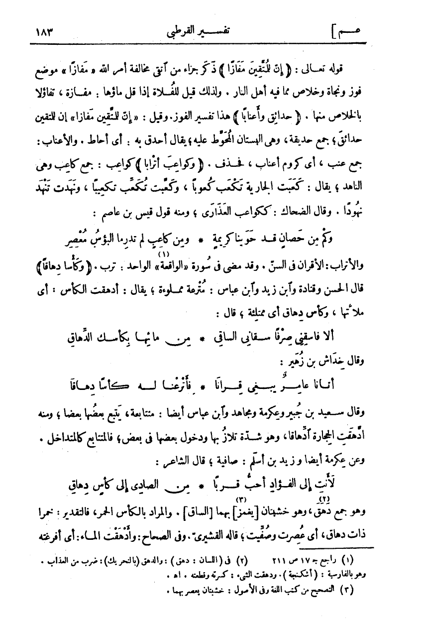 وَهُوَ جَمْعُ دَهَقٍ «٢»، وَهُوَ خَشَبَتَانِ [يُغْمَزُ «٣»] بِهِمَا [السَّاقُ]. وَالْمُرَادُ بِالْكَأْسِ الْخَمْرُ، فَالتَّقْدِيرُ: خَمْرًا ذَاتَ دِهَاقٍ، أَيْ عُصِرَتْ وَصُفِّيَتْ، قَالَهُ الْقُشَيْرِيُّ. وَفِي الصِّحَاحِ: وَأَدْهَقْتُ الْمَاءَ: أي أفرغته