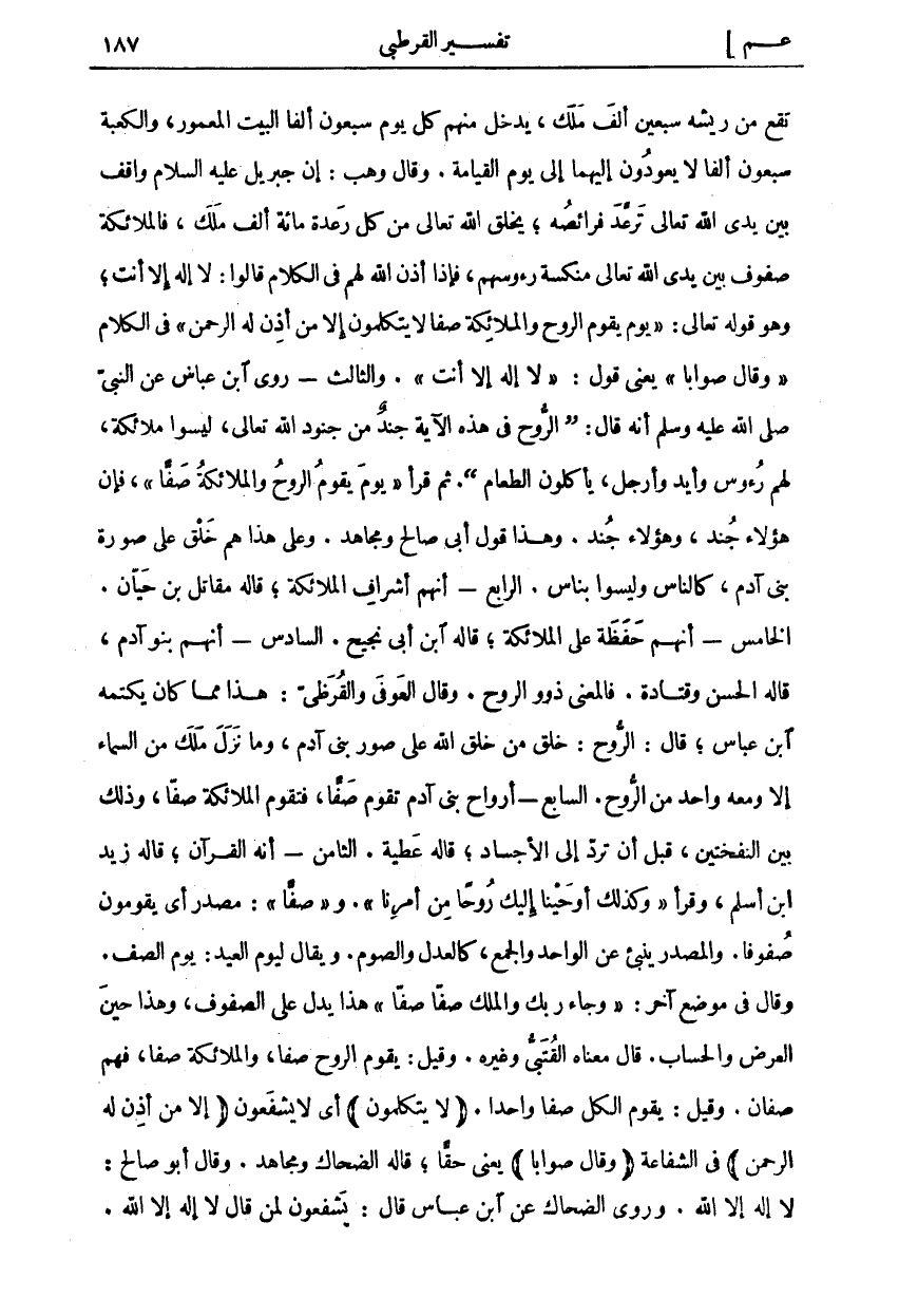 تَقَعُ مِنْ رِيشِهِ سَبْعِينَ أَلْفَ مَلَكٍ، يَدْخُلُ مِنْهُمْ كُلَّ يَوْمٍ سَبْعُونَ أَلْفًا الْبَيْتَ الْمَعْمُورِ، وَالْكَعْبَةَ سَبْعُونَ أَلْفًا لَا يَعُودُونَ إِلَيْهِمَا إِلَى يَوْمِ الْقِيَامَةِ. وَقَالَ وَهْبٌ: إِنَّ جِبْرِيلَ عَلَيْهِ السَّلَامُ وَاقِفٌ بَيْنَ يَدَيِ اللَّهِ تَعَالَى تَرْعُدُ فَرَائِصُهُ، يَخْلُقُ اللَّهُ تَعَالَى مِنْ كُلِّ رِعْدَةٍ مِائَةَ أَلْفِ مَلَكٍ، فَالْمَلَائِكَةُ صُفُوفٌ بَيْنَ يَدَيِ اللَّهِ تَعَالَى مُنَكَّسَةٌ رُؤُوسُهُمْ، فَإِذَا أَذِنَ اللَّهُ لَهُمْ فِي الْكَلَامِ قَالُوا: لَا إِلَهَ إِلَّا أَنْتَ، وَهُوَ قَوْلُهُ تَعَالَى: يَوْمَ يَقُومُ الرُّوحُ وَالْمَلائِكَةُ صَفًّا لَا يَتَكَلَّمُونَ إِلَّا مَنْ أَذِنَ لَهُ الرَّحْمنُ فِي الْكَلَامِ وَقالَ صَواباً يَعْنِي قَوْلَ: لَا إِلهَ إِلَّا أَنْتَ. وَالثَّالِثُ- رَوَى ابْنُ عَبَّاسٍ عَنِ النَّبِيِّ صَلَّى اللَّهُ عَلَيْهِ وَسَلَّمَ أَنَّهُ قَالَ: [الرُّوحُ فِي هَذِهِ الْآيَةِ جُنْدٌ مِنْ جُنُودِ اللَّهِ تَعَالَى، لَيْسُوا مَلَائِكَةً، لهم رءوس وَأَيْدٍ وَأَرْجُلٌ، يَأْكُلُونَ الطَّعَامَ [. ثُمَّ قَرَأَ يَوْمَ يَقُومُ الرُّوحُ وَالْمَلائِكَةُ صَفًّا فَإِنَّ هَؤُلَاءِ جُنْدٌ، وَهَؤُلَاءِ جُنْدٌ. وَهَذَا قَوْلُ أَبِي صَالِحٍ وَمُجَاهِدٍ. وَعَلَى هَذَا هُمْ خَلْقٌ عَلَى صُورَةِ بَنِي آدَمَ، كَالنَّاسِ وَلَيْسُوا بِنَاسٍ. الرَّابِعُ- أَنَّهُمْ أَشْرَافُ الْمَلَائِكَةِ، قَالَهُ مُقَاتِلُ بْنُ حَيَّانَ. الْخَامِسُ- أَنَّهُمْ حَفَظَةٌ عَلَى الْمَلَائِكَةِ، قَالَهُ ابْنُ أَبِي نَجِيحٍ. السَّادِسُ: أَنَّهُمْ بَنُو آدَمَ، قَالَهُ الْحَسَنُ وَقَتَادَةُ. فَالْمَعْنَى ذَوُو الرُّوحِ. وَقَالَ الْعَوْفِيُّ وَالْقُرَظِيُّ: هَذَا مِمَّا كَانَ يَكْتُمُهُ ابْنُ عَبَّاسٍ، قَالَ: الرُّوحُ: خَلْقٌ مِنْ خَلْقِ اللَّهِ عَلَى صُوَرِ بَنِي آدَمَ، وَمَا نَزَلَ مَلَكٌ مِنَ السَّمَاءِ إِلَّا وَمَعَهُ وَاحِدٌ مِنَ الرُّوحِ. السَّابِعُ: أَرْوَاحُ بَنِي آدَمَ تَقُومُ صَفًّا، فَتَقُومُ الْمَلَائِكَةُ صَفًّا، وَذَلِكَ بَيْنَ النَّفْخَتَيْنِ، قَبْلَ أَنْ تُرَدَّ إِلَى الْأَجْسَادِ، قاله عطية. الثامن- أنه القرآن، قاله زيد ابن أَسْلَمَ، وَقَرَأَ وَكَذلِكَ أَوْحَيْنا إِلَيْكَ رُوحاً مِنْ أَمْرِنا. وصَفًّا: مَصْدَرٌ أَيْ يَقُومُونَ صُفُوفًا. وَالْمَصْدَرُ يُنْبِئُ عَنِ الْوَاحِدِ وَالْجَمْعِ، كَالْعَدْلِ وَالصَّوْمِ. وَيُقَالُ لِيَوْمِ الْعِيدِ: يَوْمُ الصَّفِّ. وَقَالَ فِي مَوْضِعٍ آخَرَ: وَجاءَ رَبُّكَ وَالْمَلَكُ صَفًّا صَفًّا [الفجر: ٢٢] هَذَا يَدُلُّ عَلَى الصُّفُوفِ، وَهَذَا حِينَ الْعَرْضِ وَالْحِسَابِ. قَالَ مَعْنَاهُ الْقُتَبِيُّ وَغَيْرُهُ. وَقِيلَ: يَقُومُ الرُّوحُ صَفًّا، وَالْمَلَائِكَةُ صَفًّا، فَهُمْ صَفَّانِ. وَقِيلَ: يَقُومُ الْكُلُّ صَفًّا وَاحِدًا. لَا يَتَكَلَّمُونَ أَيْ لَا يَشْفَعُونَ إِلَّا مَنْ أَذِنَ لَهُ الرَّحْمنُ فِي الشَّفَاعَةِ وَقالَ صَواباً يَعْنِي حَقًّا، قَالَهُ الضَّحَّاكُ وَمُجَاهِدٌ. وَقَالَ أَبُو صَالِحٍ: لَا إِلَهَ إِلَّا اللَّهُ. وَرَوَى الضَّحَّاكُ عَنِ ابْنِ عَبَّاسٍ قَالَ: يَشْفَعُونَ لِمَنْ قَالَ لَا إِلَهَ إِلَّا الله.