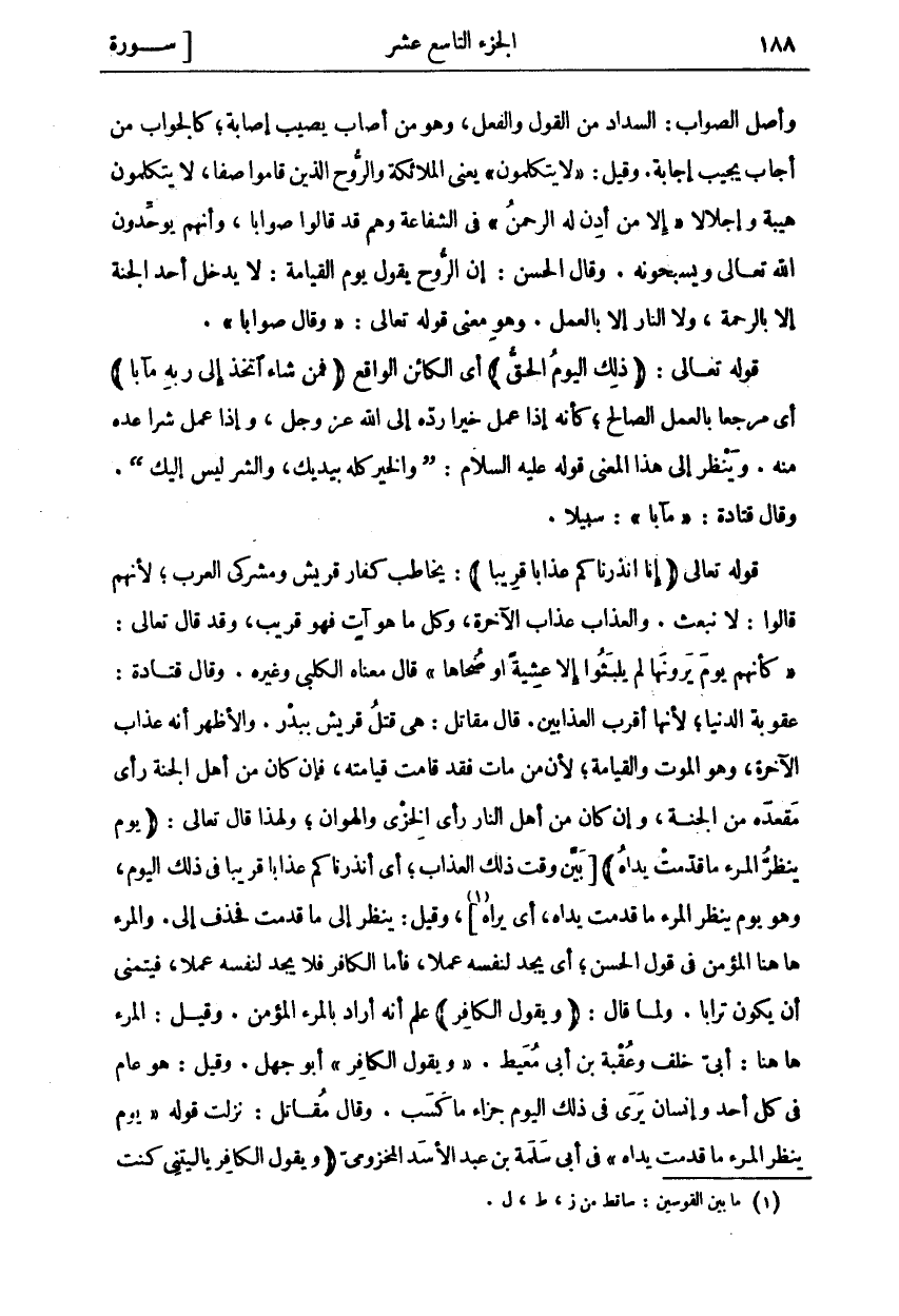 وَأَصْلُ الصَّوَابِ. السَّدَادُ مِنَ الْقَوْلِ وَالْفِعْلِ، وَهُوَ مَنْ أَصَابَ يُصِيبُ إِصَابَةً، كَالْجَوَابِ مِنْ أَجَابَ يُجِيبُ إِجَابَةً. وَقِيلَ: لَا يَتَكَلَّمُونَ يَعْنِي الْمَلَائِكَةَ وَالرُّوحَ الَّذِينَ قَامُوا صَفًّا، لَا يَتَكَلَّمُونَ هَيْبَةً وَإِجْلَالًا إِلَّا مَنْ أَذِنَ لَهُ الرَّحْمنُ فِي الشَّفَاعَةِ وَهُمْ قَدْ قَالُوا صَوَابًا، وَأَنَّهُمْ يُوَحِّدُونَ اللَّهَ تَعَالَى وَيُسَبِّحُونَهُ. وَقَالَ الْحَسَنُ: إِنَّ الرُّوحَ يَقُولُ يَوْمَ الْقِيَامَةِ: لَا يَدْخُلُ أَحَدٌ الْجَنَّةَ إِلَّا بِالرَّحْمَةِ، وَلَا النَّارَ إِلَّا بِالْعَمَلِ. وَهُوَ مَعْنَى قَوْلِهِ تَعَالَى: وَقالَ صَواباً. قَوْلُهُ تَعَالَى: ذلِكَ الْيَوْمُ الْحَقُّ أَيِ الْكَائِنُ الْوَاقِعُ فَمَنْ شاءَ اتَّخَذَ إِلى رَبِّهِ مَآباً أَيْ مَرْجِعًا بِالْعَمَلِ الصَّالِحِ، كَأَنَّهُ إِذَا عَمِلَ خَيْرًا رَدَّهُ إِلَى اللَّهِ عَزَّ وَجَلَّ، وَإِذَا عَمِلَ شَرًّا عَدَّهُ مِنْهُ. وَيَنْظُرُ إِلَى هَذَا الْمَعْنَى قَوْلُهُ عَلَيْهِ السَّلَامُ: [وَالْخَيْرُ كُلُّهُ بِيَدَيْكَ، وَالشَّرُّ لَيْسَ إِلَيْكَ [. وَقَالَ قَتَادَةُ: مَآباً: سَبِيلًا. قَوْلُهُ تَعَالَى: ِنَّا أَنْذَرْناكُمْ عَذاباً قَرِيباً)