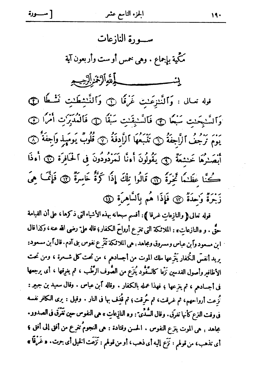 سُورَةُ النَّازِعَاتِ مَكِّيَّةٌ بِإِجْمَاعٍ. وَهِيَ خَمْسٌ أَوْ سِتٌّ وَأَرْبَعُونَ آيَةً بِسْمِ اللَّهِ الرَّحْمنِ الرَّحِيمِ