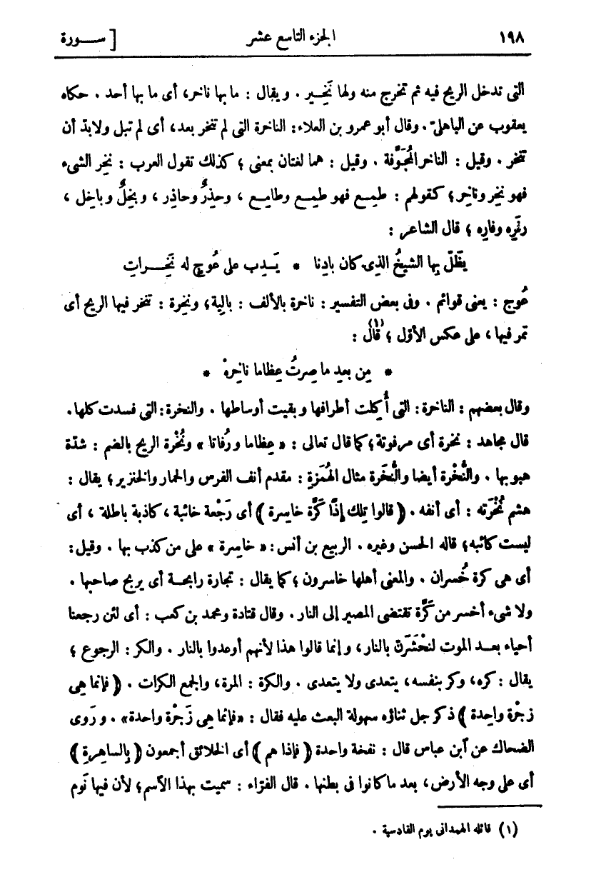 وَقَالَ بَعْضُهُمْ: النَّاخِرَةُ: الَّتِي أُكِلَتْ أَطْرَافُهَا وَبَقِيَتْ أَوْسَاطُهَا. وَالنَّخِرَةُ: الَّتِي فَسَدَتْ كُلُّهَا. قَالَ مُجَاهِدٌ: نَخِرَةٌ أَيْ مَرْفُوتَةٌ، كَمَا قَالَ تَعَالَى: عِظاماً وَرُفاتاً وَنُخْرَةُ الرِّيحِ بِالضَّمِّ: شِدَّةُ هُبُوبِهَا. وَالنُّخْرَةُ أَيْضًا وَالنُّخَرَةُ مِثَالُ الْهُمَزَةِ: مُقَدَّمُ أَنْفِ الْفَرَسِ وَالْحِمَارِ وَالْخِنْزِيرِ، يُقَالُ: هَشَّمَ نُخْرَتَهُ: أَيْ أَنْفَهُ. (قالُوا تِلْكَ إِذاً كَرَّةٌ خاسِرَةٌ) أَيْ رَجْعَةٌ خَائِبَةٌ، كَاذِبَةٌ بَاطِلَةٌ، أَيْ لَيْسَتْ كَائِبَةً، قَالَهُ الْحَسَنُ وَغَيْرُهُ. الرَّبِيعُ بْنُ أَنَسٍ: خاسِرَةٌ عَلَى مَنْ كَذَّبَ بِهَا. وَقِيلَ: أَيْ هِيَ كَرَّةُ خُسْرَانٍ. وَالْمَعْنَى أَهْلُهَا خَاسِرُونَ، كَمَا يُقَالُ: تِجَارَةٌ رَابِحَةٌ أَيْ يربح صاحبها. ولا شي أَخْسَرُ مِنْ كَرَّةٍ تَقْتَضِي الْمَصِيرَ إِلَى النَّارِ. وَقَالَ قَتَادَةُ وَمُحَمَّدُ بْنُ كَعْبٍ: أَيْ لَئِنْ رَجَعْنَا أَحْيَاءً بَعْدَ الْمَوْتِ لَنُحْشَرَنَّ بِالنَّارِ، وَإِنَّمَا قالوا هذا لأنهم أو عدوا بِالنَّارِ. وَالْكَرُّ: الرُّجُوعُ، يُقَالُ: كَرَّهُ، وَكَرَّ بِنَفْسِهِ، يَتَعَدَّى وَلَا يَتَعَدَّى. وَالْكَرَّةُ: الْمَرَّةُ، وَالْجَمْعُ الْكَرَّاتُ. (فَإِنَّما هِيَ زَجْرَةٌ واحِدَةٌ) ذَكَرَ جَلَّ ثَنَاؤُهُ سُهُولَةَ الْبَعْثِ عَلَيْهِ فَقَالَ: فَإِنَّما هِيَ زَجْرَةٌ واحِدَةٌ. وَرَوَى الضَّحَّاكُ عَنِ ابْنِ عَبَّاسٍ قَالَ: نَفْخَةٌ وَاحِدَةٌ فَإِذا هُمْ أَيِ الْخَلَائِقُ أَجْمَعُونَ بِالسَّاهِرَةِ أَيْ عَلَى وَجْهِ الْأَرْضِ، بَعْدَ مَا كَانُوا فِي بَطْنِهَا. قَالَ الْفَرَّاءُ: سُمِّيَتْ بِهَذَا الاسم، لان فيها نوم