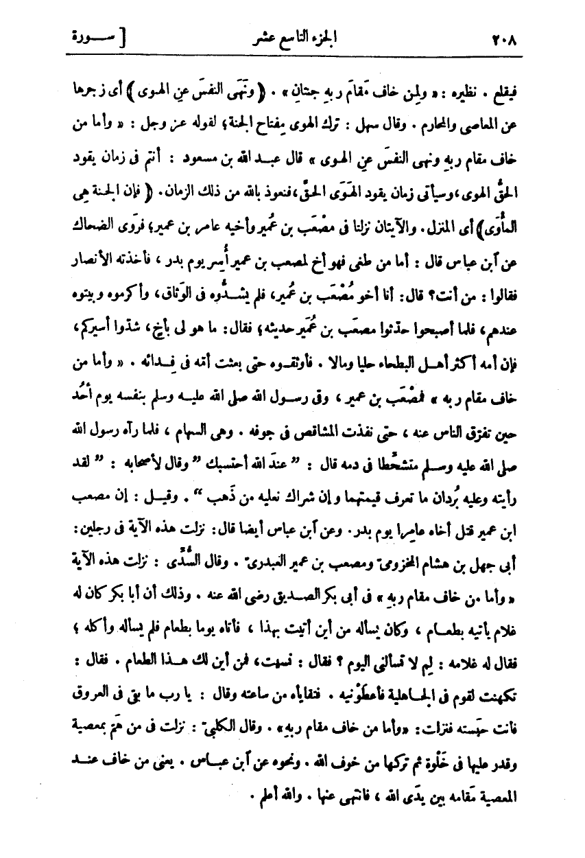 فَيُقْلِعُ. نَظِيرُهُ: وَلِمَنْ خافَ مَقامَ رَبِّهِ جَنَّتانِ [الرحمن: ٤٦]. (وَنَهَى النَّفْسَ عَنِ الْهَوى) أَيْ زَجَرَهَا عَنِ الْمَعَاصِي وَالْمَحَارِمِ. وَقَالَ سَهْلٌ: تَرْكُ الْهَوَى مِفْتَاحُ الْجَنَّةِ، لِقَوْلِهِ عَزَّ وَجَلَّ: وَأَمَّا مَنْ خافَ مَقامَ رَبِّهِ وَنَهَى النَّفْسَ عَنِ الْهَوى قَالَ عَبْدُ اللَّهِ بْنُ مَسْعُودٍ: أَنْتُمْ فِي زَمَانٍ يَقُودُ الْحَقُّ الْهَوَى، وَسَيَأْتِي زَمَانٌ يَقُودُ الْهَوَى الْحَقَّ فَنَعُوذُ بِاللَّهِ مِنْ ذَلِكَ الزَّمَانِ. (فَإِنَّ الْجَنَّةَ هِيَ الْمَأْوى) أَيِ الْمَنْزِلُ. وَالْآيَتَانِ نَزَلَتَا فِي مُصْعَبِ بْنِ عُمَيْرٍ وَأَخِيهِ عَامِرِ بْنِ عُمَيْرٍ، فَرَوَى الضَّحَّاكُ عَنِ ابْنِ عَبَّاسٍ قَالَ: أَمَّا مَنْ طَغَى فَهُوَ أَخٌ لِمُصْعَبِ بْنُ عُمَيْرٍ أُسِرَ يَوْمَ بَدْرٍ، فَأَخَذَتْهُ الْأَنْصَارُ فَقَالُوا: مَنْ أَنْتَ؟ قَالَ: أَنَا أَخُو مُصْعَبِ بْنِ عُمَيْرٍ، فَلَمْ يَشُدُّوهُ فِي الْوَثَاقِ، وَأَكْرَمُوهُ وَبَيَّتُوهُ عِنْدَهُمْ، فَلَمَّا أَصْبَحُوا حَدَّثُوا مُصْعَبَ بْنَ عُمَيْرٍ حَدِيثَهُ، فَقَالَ: مَا هُوَ لِي بِأَخٍ، شُدُّوا أَسِيرَكُمْ، فَإِنَّ أُمَّهُ أَكْثَرُ أَهْلِ الْبَطْحَاءِ حُلِيًّا وَمَالًا. فَأَوْثَقُوهُ حَتَّى بَعَثَتْ أُمُّهُ فِي فِدَائِهِ. وَأَمَّا مَنْ خافَ مَقامَ رَبِّهِ فَمُصْعَبُ بْنُ عُمَيْرٍ، وَقَى رَسُولَ اللَّهِ صَلَّى اللَّهُ عَلَيْهِ وَسَلَّمَ بِنَفْسِهِ يَوْمَ أُحُدٍ حِينَ تَفَرَّقَ النَّاسُ عَنْهُ، حَتَّى نَفَذَتِ الْمَشَاقِصُ فِي جَوْفِهِ. وَهِيَ السِّهَامُ، فَلَمَّا رَآهُ رَسُولُ اللَّهِ صَلَّى اللَّهُ عَلَيْهِ وَسَلَّمَ مُتَشَحِّطًا فِي دَمِهِ قَالَ: [عِنْدَ اللَّهِ أَحْتَسِبُكِ [وَقَالَ لِأَصْحَابِهِ: [لَقَدْ رَأَيْتُهُ وَعَلَيْهِ بُرْدَانِ مَا تُعْرَفُ قِيمَتُهُمَا وَإِنَّ شِرَاكَ نَعْلَيْهِ من ذهب [. وقيل: إن مصعب ابن عُمَيْرٍ قَتَلَ أَخَاهُ عَامِرًا يَوْمَ بَدْرٍ. وَعَنِ ابْنِ عَبَّاسٍ أَيْضًا قَالَ: نَزَلَتْ هَذِهِ الْآيَةُ فِي رَجُلَيْنِ: أَبِي جَهْلِ بْنِ هِشَامٍ الْمَخْزُومِيِّ وَمُصْعَبِ بْنِ عُمَيْرٍ الْعَبْدَرِيِّ. وَقَالَ السُّدِّيُّ: نَزَلَتْ هَذِهِ الْآيَةُ وَأَمَّا مَنْ خافَ مَقامَ رَبِّهِ فِي أَبِي بَكْرٍ الصِّدِّيقِ رَضِيَ اللَّهُ عَنْهُ. وَذَلِكَ أَنَّ أَبَا بَكْرٍ كَانَ لَهُ غُلَامٌ يَأْتِيهِ بِطَعَامٍ، وَكَانَ يَسْأَلُهُ مِنْ أَيْنَ أَتَيْتَ بِهَذَا، فَأَتَاهُ يَوْمًا بِطَعَامٍ فَلَمْ يَسْأَلْ وَأَكَلَهُ، فَقَالَ لَهُ غُلَامُهُ: لِمَ لَا تَسْأَلْنِي الْيَوْمَ؟ فَقَالَ: نَسِيَتُ، فَمِنْ أَيْنَ لَكَ هَذَا الطَّعَامُ. فَقَالَ: تَكَهَّنْتُ لِقَوْمٍ فِي الْجَاهِلِيَّةِ فَأَعْطَوْنِيهِ. فَتَقَايَأَهُ مِنْ سَاعَتِهِ وَقَالَ: يَا رَبُّ مَا بَقِيَ فِي الْعُرُوقِ فَأَنْتَ حَبَسْتَهُ فَنَزَلَتْ: وَأَمَّا مَنْ خافَ مَقامَ رَبِّهِ. وَقَالَ الْكَلْبِيُّ: نَزَلَتْ فِي مَنْ هَمَّ بِمَعْصِيَةٍ وَقَدَرَ عَلَيْهَا فِي خَلْوَةٍ ثُمَّ تَرَكَهَا مِنْ خَوْفِ اللَّهِ. وَنَحْوَهُ عَنِ ابْنِ عَبَّاسٍ. يَعْنِي مَنْ خَافَ عِنْدَ الْمَعْصِيَةِ مَقَامَهُ بَيْنَ يَدَيِ اللَّهِ، فَانْتَهَى عَنْهَا. وَاللَّهُ أعلم.