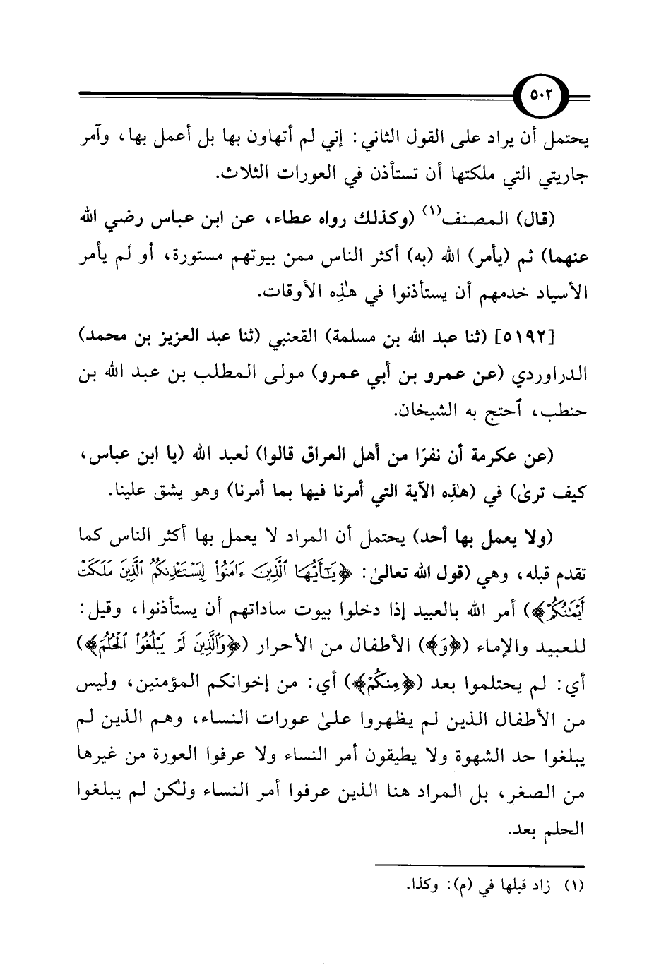 (قال) المصنف (¬1) (وكذلك رواه عطاء، عن ابن عباس رضي اللَّه عنهما) ثم (يأمر) اللَّه (به) أكثر الناس ممن بيوتهم مستورة، أو لم يأمر الأسياد خدمهم أن يستأذنوا في هذِه الأوقات.