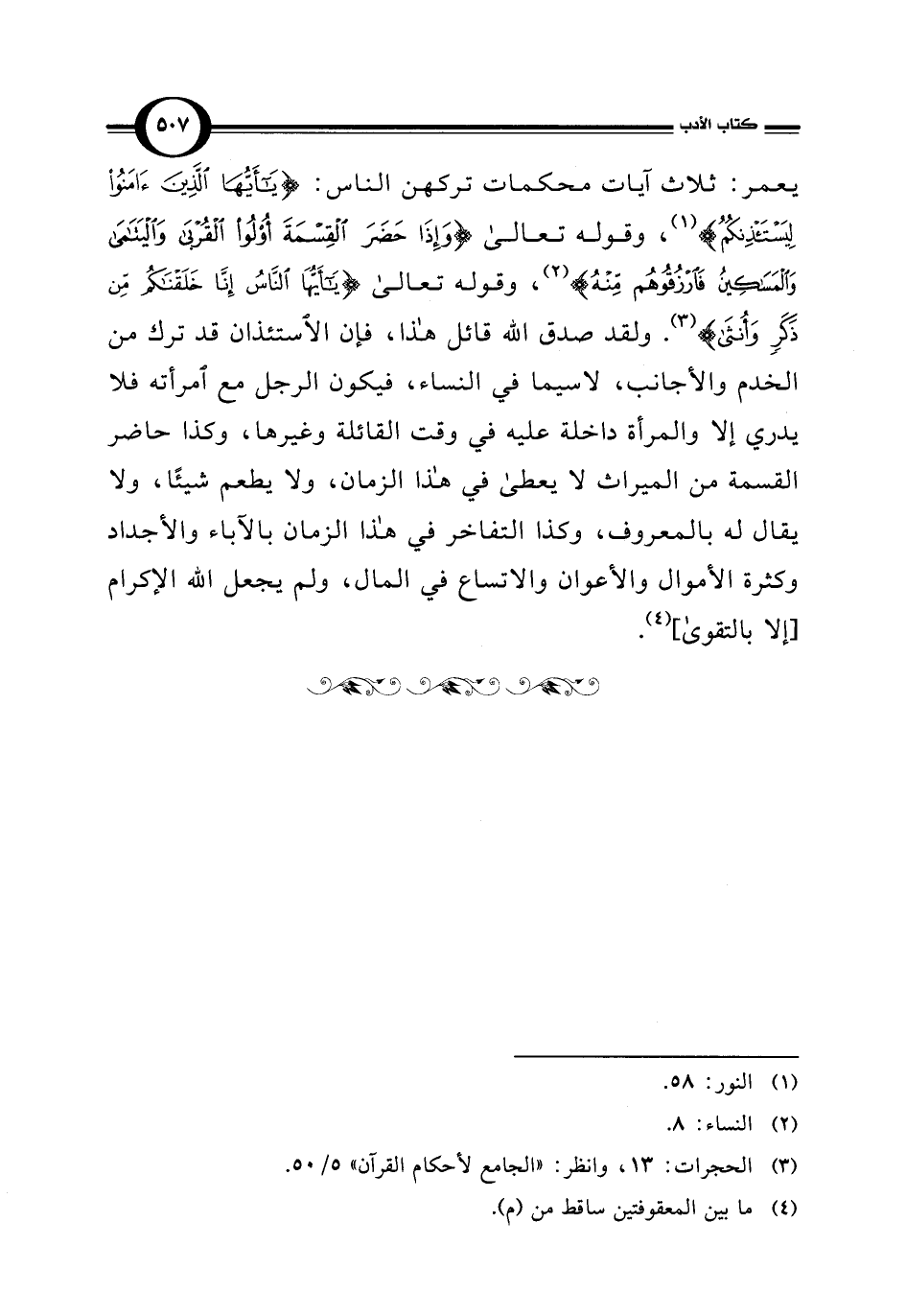 يعمر: ثلاث آيات محكمات تركهن الناس: {يَاأَيُّهَا الَّذِينَ آمَنُوا لِيَسْتَأْذِنْكُمُ} (¬1)، وقوله تعالى {وَإِذَا حَضَرَ الْقِسْمَةَ أُولُو الْقُرْبَى وَالْيَتَامَى وَالْمَسَاكِينُ فَارْزُقُوهُمْ مِنْهُ} (¬2)، وقوله تعالى {يَاأَيُّهَا النَّاسُ إِنَّا خَلَقْنَاكُمْ مِنْ ذَكَرٍ وَأُنْثَى} (¬3). ولقد صدق اللَّه قائل هذا، فإن الاستئذان قد ترك من الخدم والأجانب، لا سيما في النساء، فيكون الرجل مع امرأته فلا يدري إلا والمرأة داخلة عليه في وقت القائلة وغيرها، وكذا حاضر القسمة من الميراث لا يعطى في هذا الزمان، ولا يطعم شيئًا, ولا يقال له بالمعروف، وكذا التفاخر في هذا الزمان بالآباء والأجداد وكثرة الأموال والأعوان والاتساع في المال، ولم يجعل اللَّه الإكرام [إلا بالتقوى] (¬4).