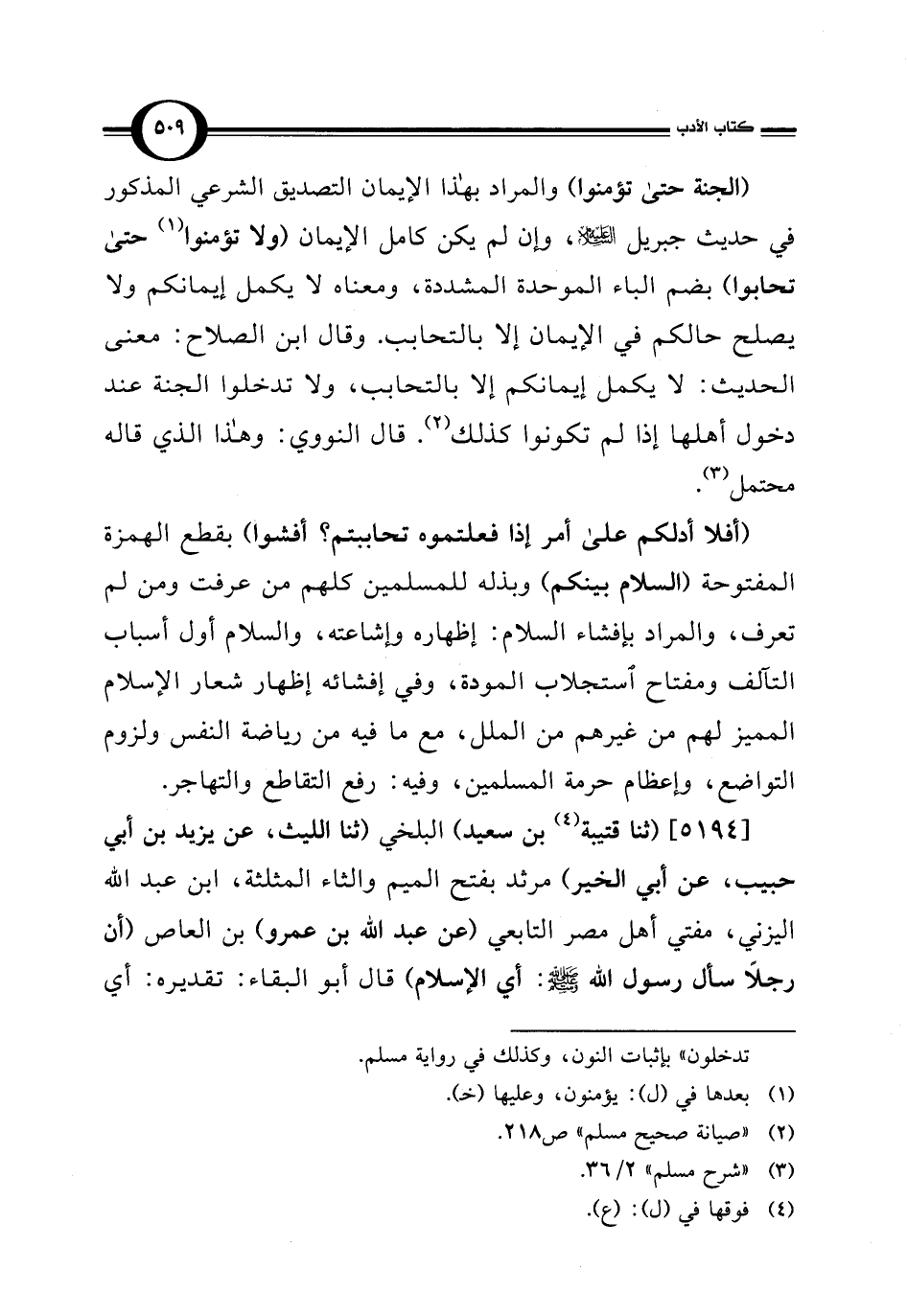 (الجنة حتى تؤمنوا) والمراد بهذا الإيمان التصديق الشرعي المذكور في حديث جبريل عليه السلام، وإن لم يكن كامل الإيمان (ولا تؤمنوا (¬1) حتى تحابوا) بضم الباء الموحدة المشددة، ومعناه لا يكمل إيمانكم ولا يصلح حالكم في الإيمان إلا بالتحابب. وقال ابن الصلاح: معنى الحديث: لا يكمل إيمانكم إلا بالتحابب، ولا تدخلوا الجنة عند دخول أهلها إذا لم تكونوا كذلك (¬2). قال النووي: وهذا الذي قاله محتمل (¬3).