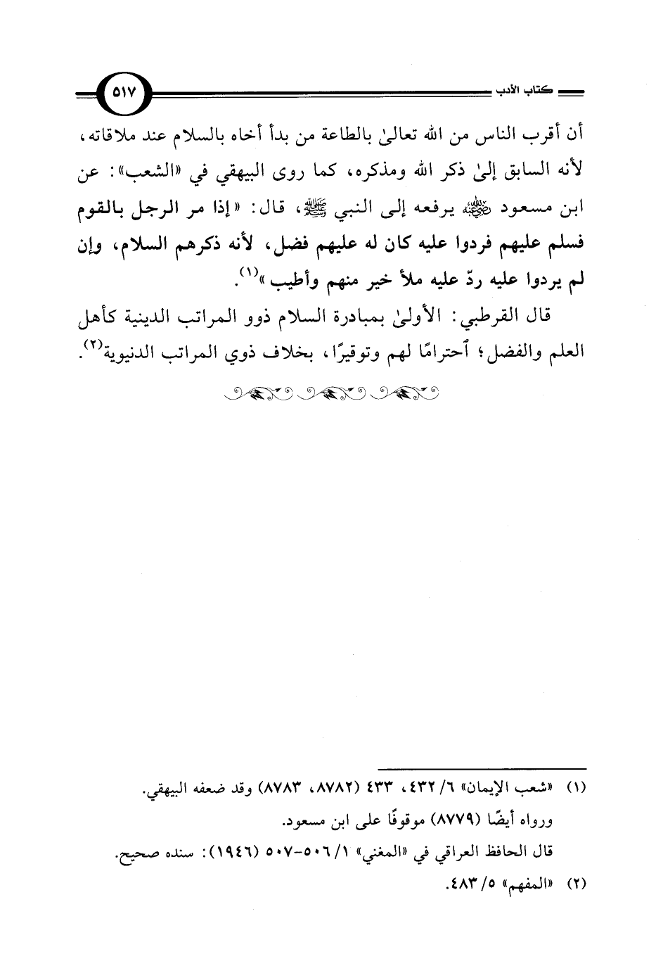 قال القرطبي: الأولى بمبادرة السلام ذوو المراتب الدينية كأهل العلم والفضل؛ احترامًا لهم وتوقيرًا، بخلاف ذوي المراتب الدنيوية (¬2).