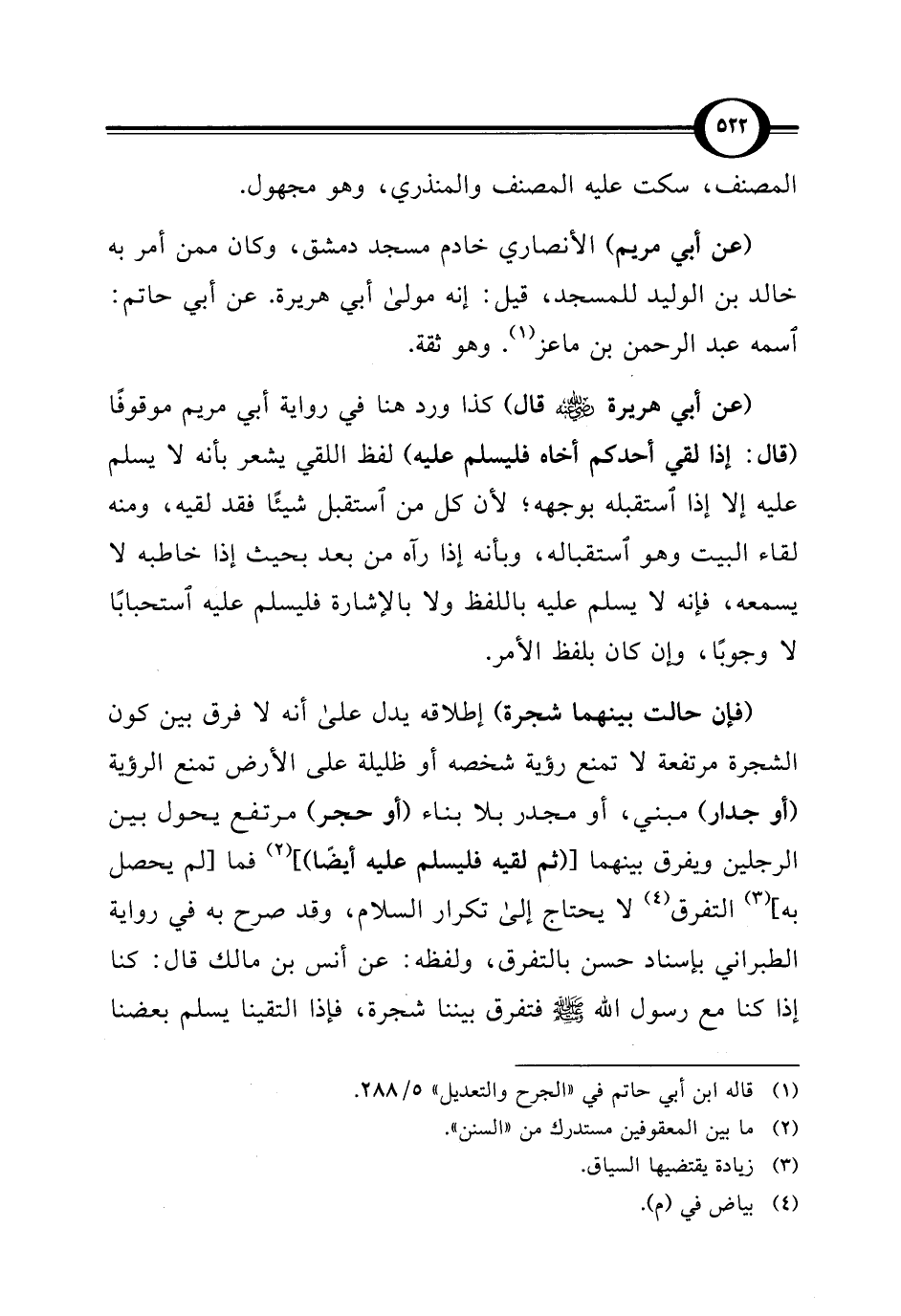 (فإن حالت بينهما شجرة) إطلاقه يدل على أنه لا فرق بين كون الشجرة مرتفعة لا تمنع رؤية شخصه أو ظليلة على الأرض تمنع الرؤية (أو جدار) مبني، أو مجدر بلا بناء (أو حجر) مرتفع يحول بين الرجلين ويفرق بينهما [(ثم لقيه فليسلم عليه أيضًا)] (¬2) فما [لم يحصل به] (¬3) التفرق (¬4) لا يحتاج إلى تكرار السلام، وقد صرح به في رواية الطبراني بإسناد حسن بالتفرق، ولفظه: عن أنس بن مالك قال: كنا إذا كنا مع رسول اللَّه -صلى اللَّه عليه وسلم- فتفرق بيننا شجرة، فإذا التقينا يسلم بعضنا