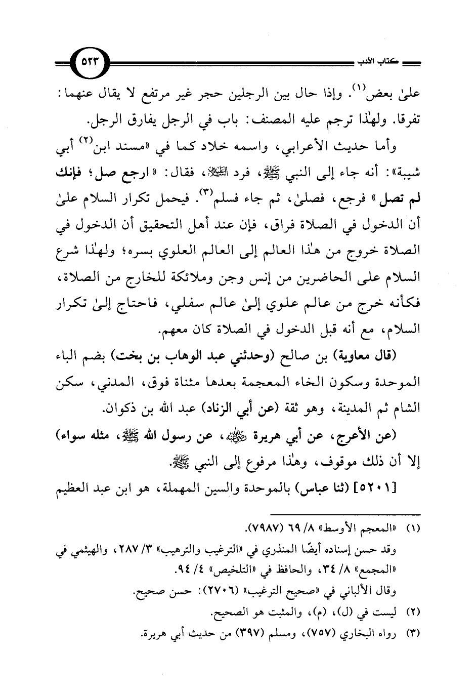 وأما حديث الأعرابي، واسمه خلاد كما في "مسند ابن (¬2) أبي شيبة": أنه جاء إلى النبي -صلى اللَّه عليه وسلم-، فرد عليه السلام، فقال: "ارجع صل؛ فإنك لم تصل" فرجع، فصلى، ثم جاء فسلم (¬3). فيحمل تكرار السلام على أن الدخول في الصلاة فراق، فإن عند أهل التحقيق أن الدخول في الصلاة خروج من هذا العالم إلى العالم العلوي بسره؛ ولهذا شرع السلام على الحاضرين من إنس وجن وملائكة للخارج من الصلاة، فكأنه خرج من عالم علوي إلى عالم سفلي، فاحتاج إلى تكرار السلام، مع أنه قبل الدخول في الصلاة كان معهم.