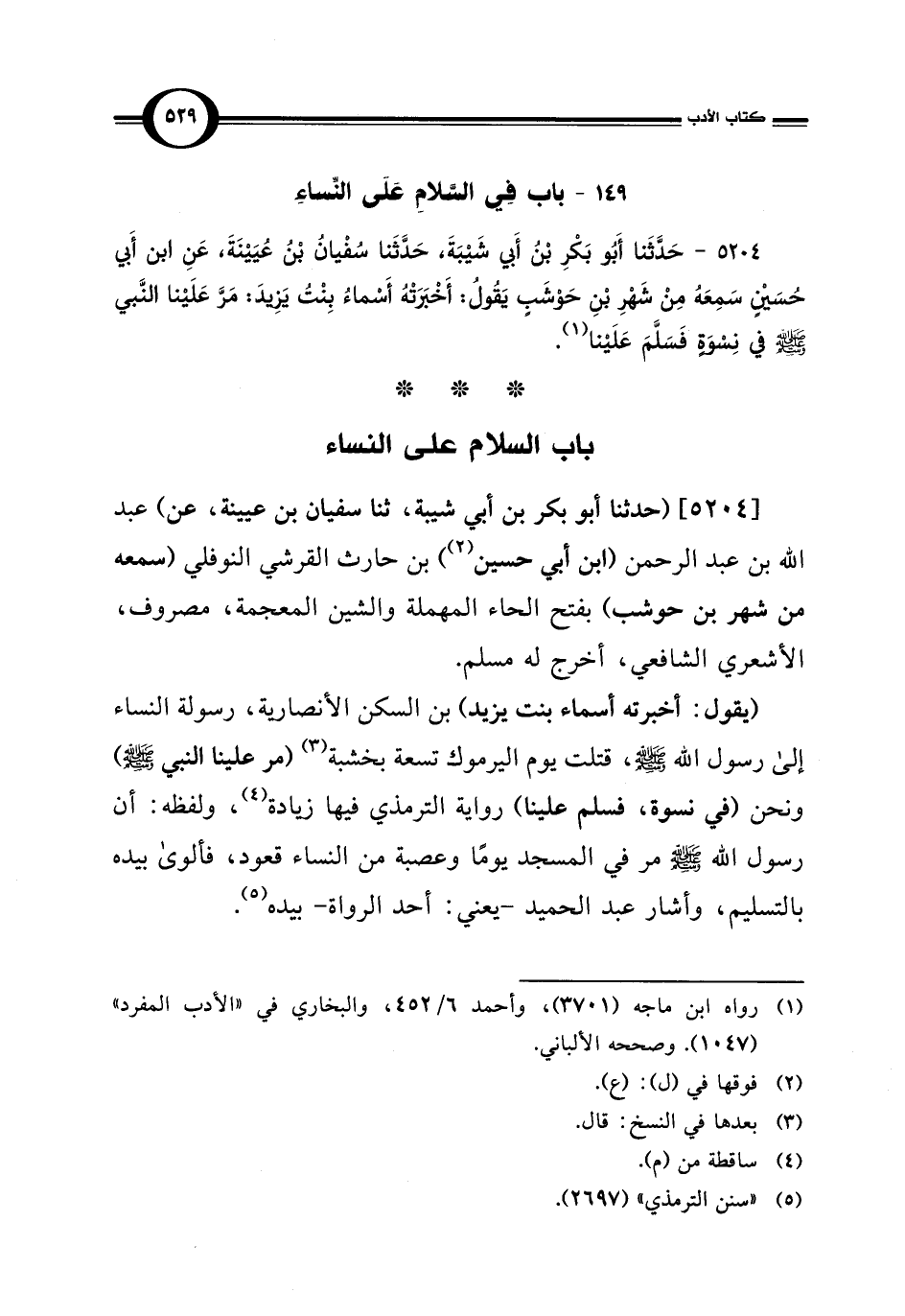 (يقول: أخبرته أسماء بنت يزيد) بن السكن الأنصارية، رسولة النساء إلى رسول اللَّه -صلى اللَّه عليه وسلم-، قتلت يوم اليرموك تسعة بخشبة (¬3) (مر علينا النبي -صلى اللَّه عليه وسلم-) ونحن (في نسوة، فسلم علينا) رواية الترمذي فيها زيادة (¬4)، ولفظه: أن رسول اللَّه -صلى اللَّه عليه وسلم- مر في المسجد يومًا وعصبة من النساء قعود، فألوى بيده بالتسليم، وأشار عبد الحميد -يعني: أحد الرواة- بيده (¬5).