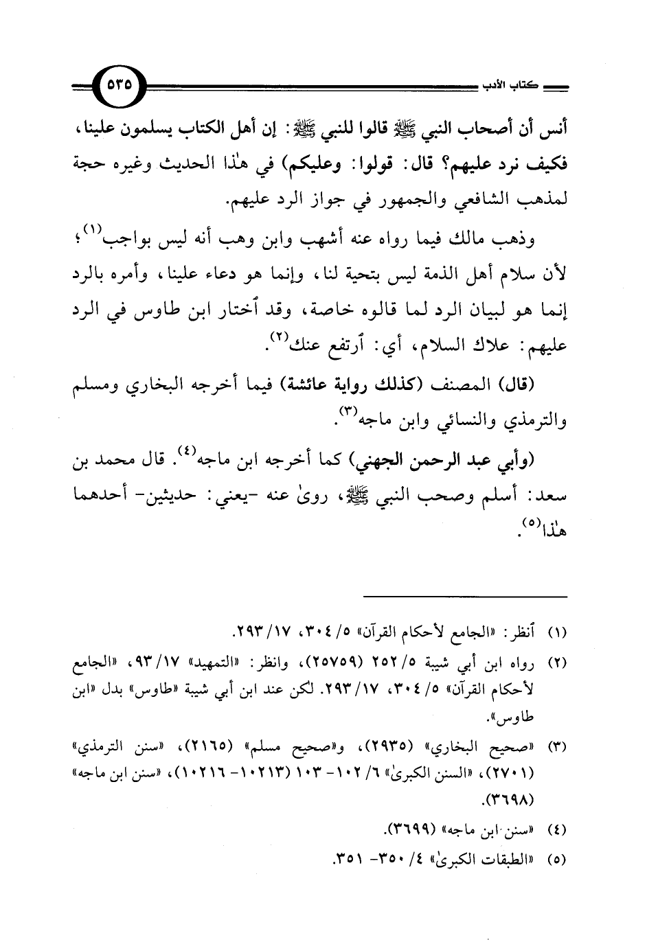 أنس أن أصحاب النبي -صلى اللَّه عليه وسلم- قالوا للنبي -صلى اللَّه عليه وسلم-: إن أهل الكتاب يسلمون علينا، فكيف نرد عليهم؟ قال: قولوا: وعليكم) في هذا الحديث وغيره حجة لمذهب الشافعي والجمهور في جواز الرد عليهم.