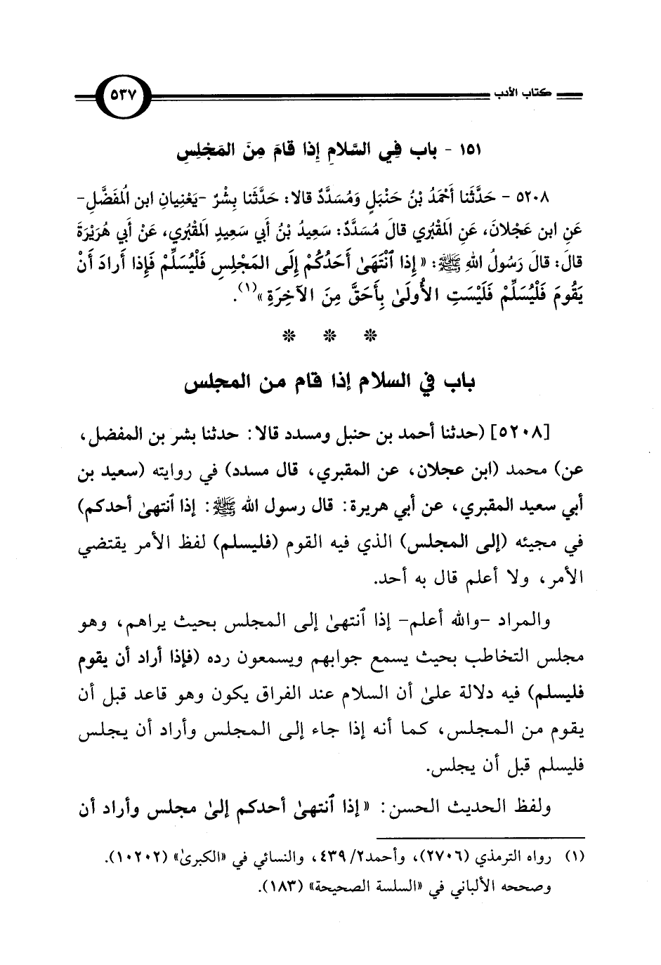 [5208] (حدثنا أحمد بن حنبل ومسدد قالا: حدثنا بشر بن المفضل، عن) محمد (ابن عجلان، عن المقبري، قال مسدد) في روايته (سعيد بن أبي سعيد المقبري، عن أبي هريرة: قال رسول اللَّه -صلى اللَّه عليه وسلم-: إذا انتهى أحدكم) في مجيئه (إلى المجلس) الذي فيه القوم (فليسلم) لفظ الأمر يقتضي الأمر، ولا أعلم قال به أحد.