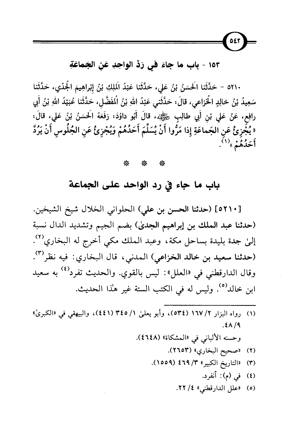 [5210] (حدثنا الحسن بن علي) الحلواني الخلال شيخ الشيخين. (حدثنا عبد الملك بن إبراهيم الجدى) بضم الجيم وتشديد الدال نسبة إلى جدة بليدة بساحل مكة، وعبد الملك مكي أخرج له البخاري (¬2). (حدثنا سعيد بن خالد الخزاعى) المدني، قال البخاري: فيه نظر (¬3). وقال الدارقطني في "العلل": ليس بالقوي. والحديث تفرد (¬4) به سعيد ابن خالد (¬5). وليس له في الكتب الستة غير هذا الحديث.