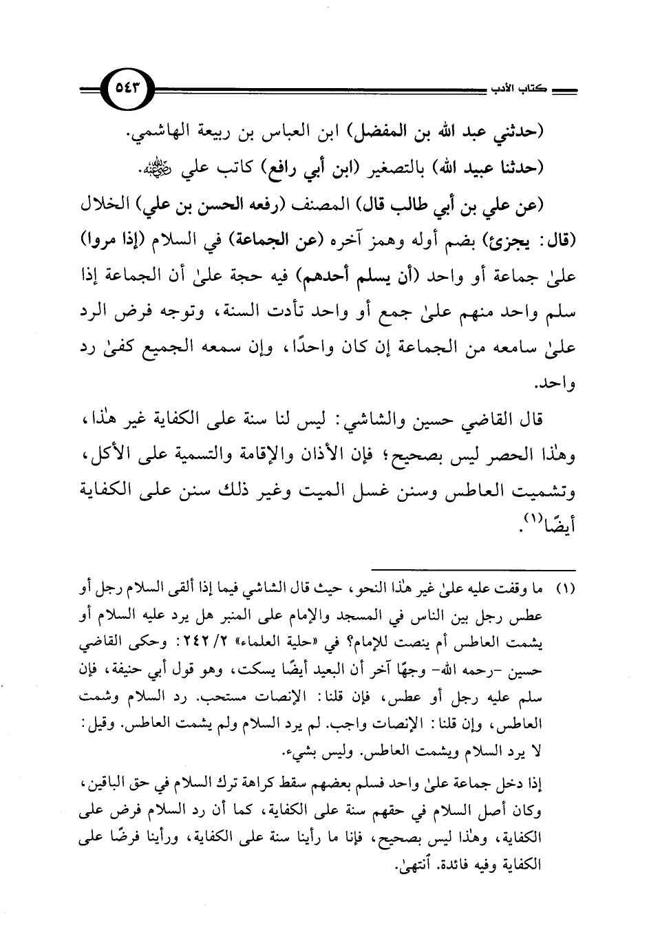 إذا دخل جماعة على واحد فسلم بعضهم سقط كراهة ترك السلام في حق الباقين، وكان أصل السلام في حقهم سنة على الكفاية، كما أن رد السلام فرض على الكفاية، وهذا ليس بصحيح، فإنا ما رأينا سنة على الكفاية، ورأينا فرضًا على الكفاية وفيه فائدة. انتهى.