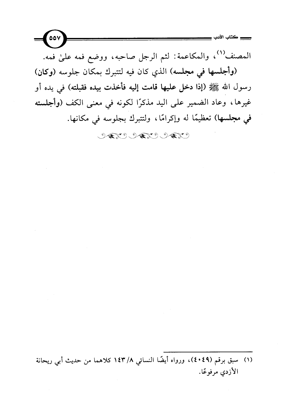 (وأجلسها في مجلسه) الذي كان فيه لتتبرك بمكان جلوسه (وكان) رسول اللَّه -صلى اللَّه عليه وسلم- (إذا دخل عليها قامت إليه فأخذت بيده فقبلته) في يده أو غيرها، وعاد الضمير على اليد مذكرًا لكونه في معنى الكف (وأجلسته في مجلسها) تعظيمًا له وإكرامًا، ولتتبرك بجلوسه في مكانها.