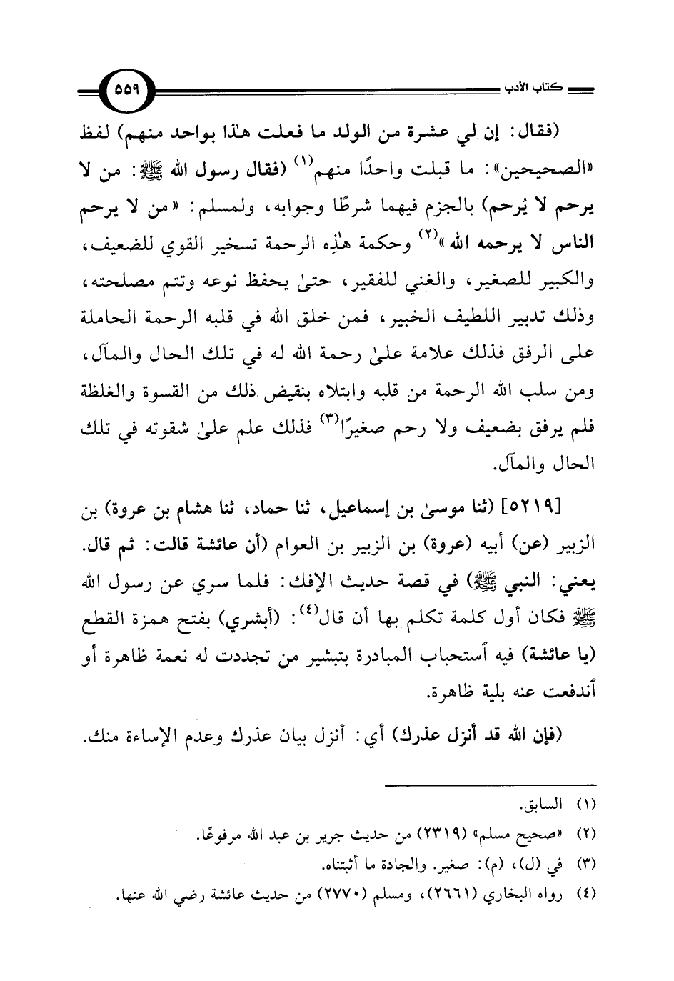 [5219] (ثنا موسى بن إسماعيل، ثنا حماد، ثنا هشام بن عروة) بن الزبير (عن) أبيه (عروة) بن الزبير بن العوام (أن عائشة قالت: ثم قال. يعني: النبي -صلى اللَّه عليه وسلم-) في قصة حديث الإفك: فلما سري عن رسول اللَّه -صلى اللَّه عليه وسلم- فكان أول كلمة تكلم بها أن قال (¬4): (أبشري) بفتح همزة القطع (يا عائشة) فيه استحباب المبادرة بتبشير من تجددت له نعمة ظاهرة أو اندفعت عنه بلية ظاهرة.