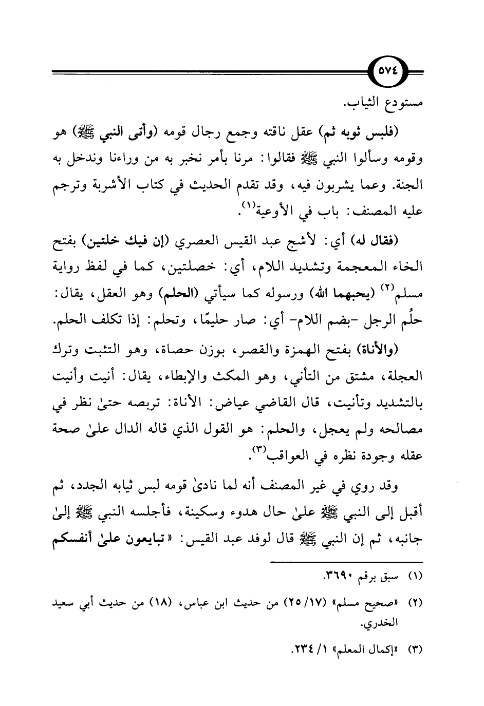 (فلبس ثوبه ثم) عقل ناقته وجمع رجال قومه (وأتى النبي -صلى اللَّه عليه وسلم-) هو وقومه وسألوا النبي -صلى اللَّه عليه وسلم- فقالوا: مرنا بأمر نخبر به من وراءنا وندخل به الجنة. وعما يشربون فيه، وقد تقدم الحديث في كتاب الأشربة وترجم عليه المصنف: باب في الأوعية (¬1).